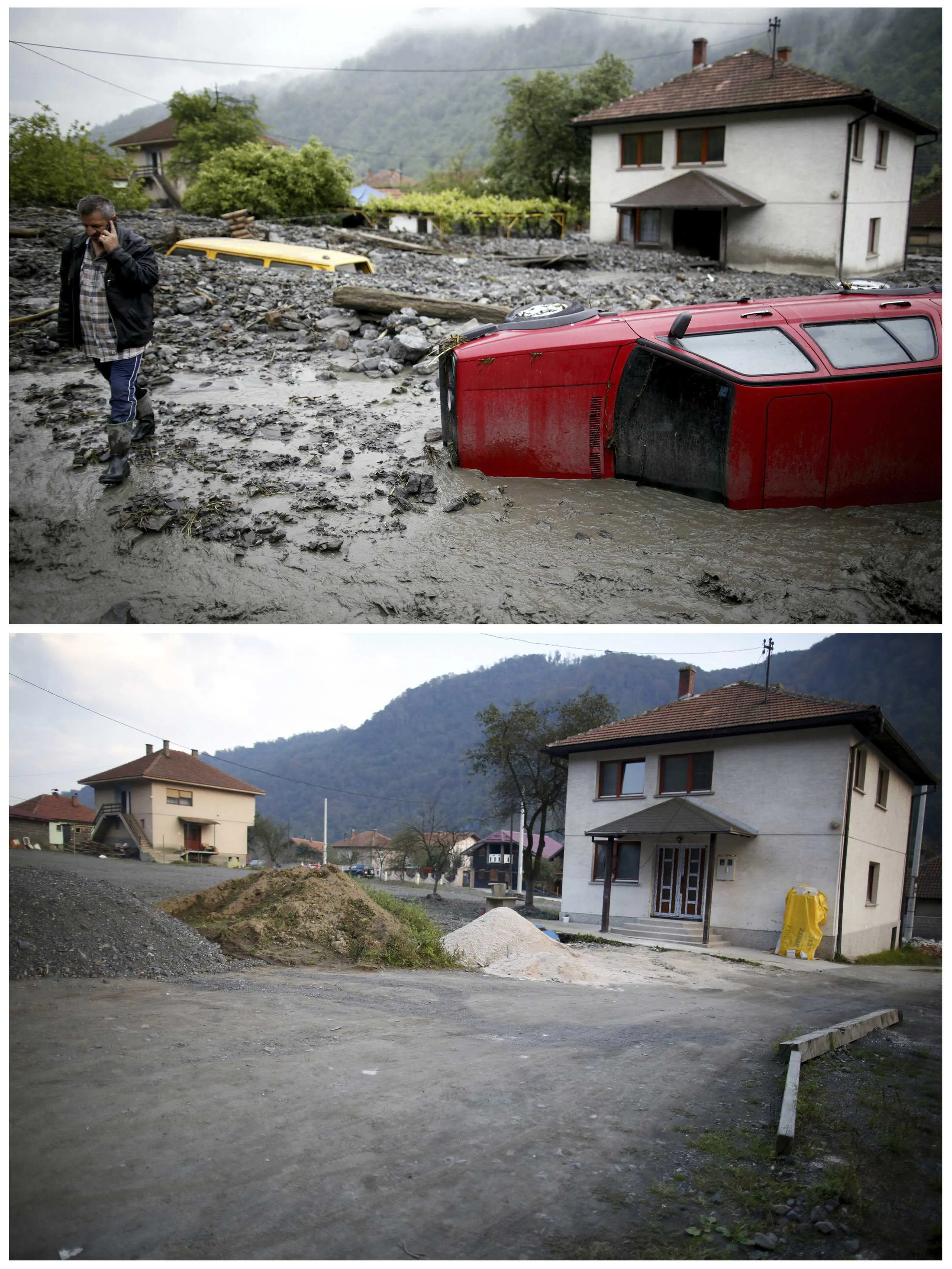 A combination photo shows Asim Skopljak talking on a mobile phone as he walks near a car stranded during floods May 16, 2014 (top) and the same place after floods October 8, 2014 in Topcic Polje. (Photo by Dado Ruvic/Reuters)