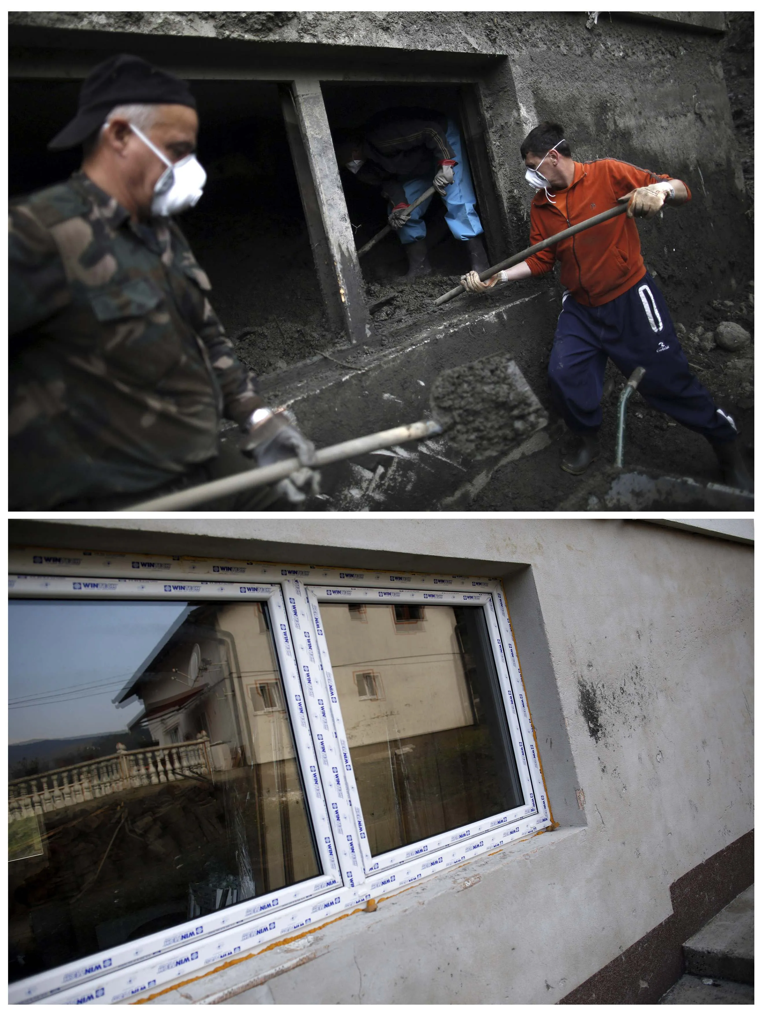 A combination photo shows members of the Kovacevic family clearing mud away from the kitchen in their flood-damaged home during floods May 31, 2014 (top) and the same place after floods October 8, 2014 in Topcic Polje. (Photo by Dado Ruvic/Reuters)