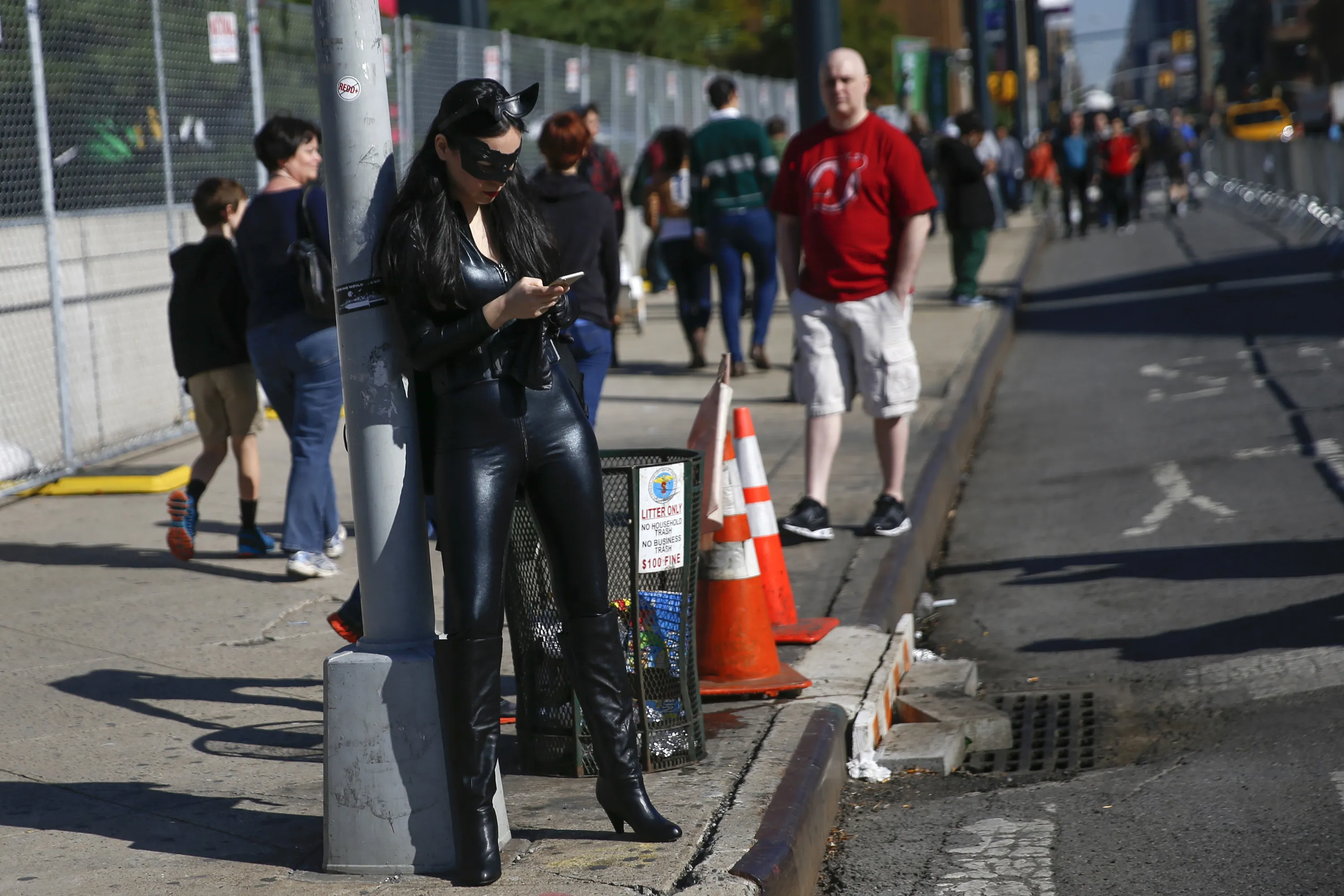 Kim Kwai dressed as the character “Cat Woman”, stands on a street corner outside of the New York's Comic-Con convention, October 9, 2014. (Photo by Shannon Stapleton/Reuters)
