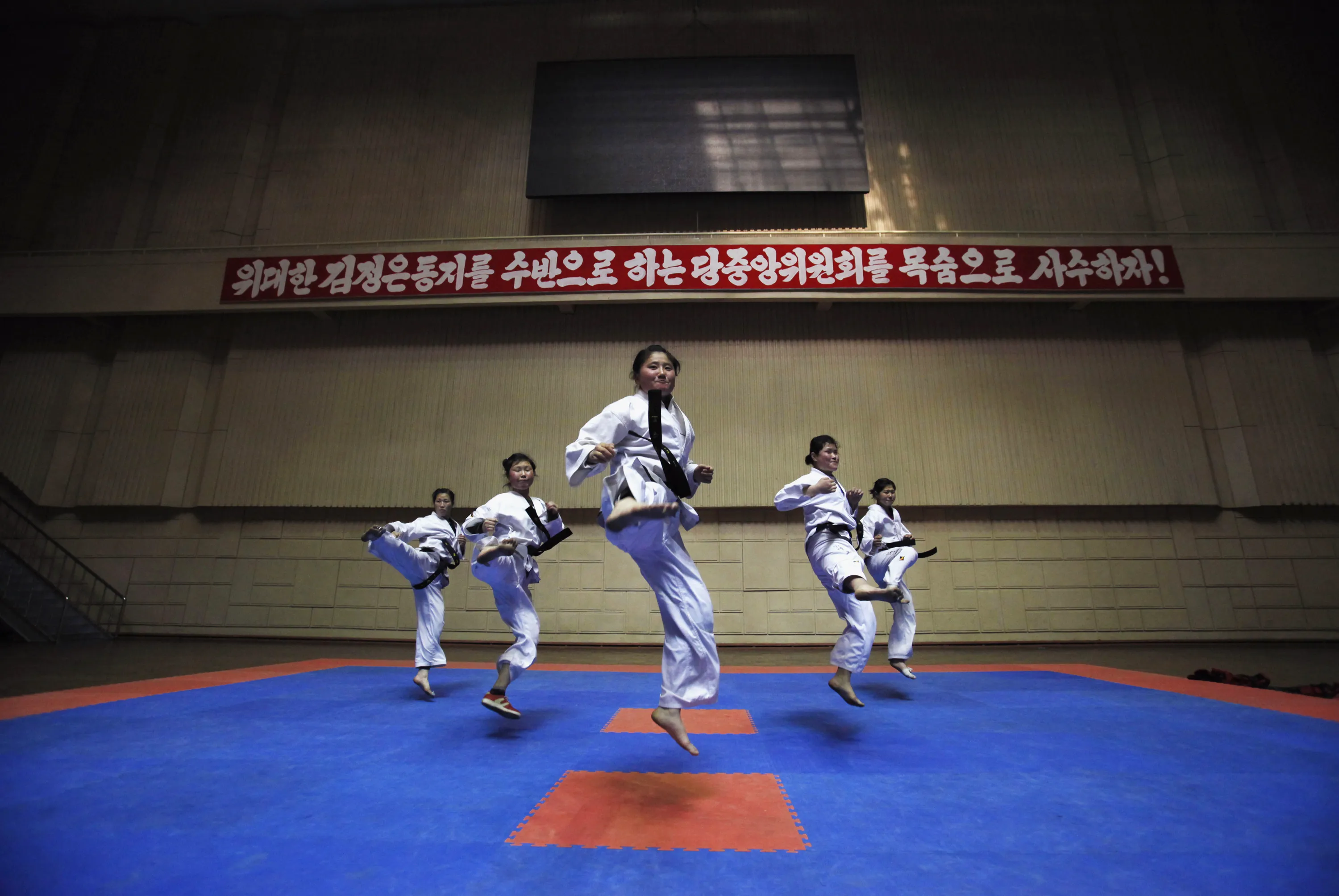 Girls train in a Taekwondo Hall in Pyongyang April 12, 2012. The banner at background reads “Let us defend the Party Central Committee headed by the respected comrade Kim Jong-un, at the cost of our lives!”. (Photo by Bobby Yip/Reuters)