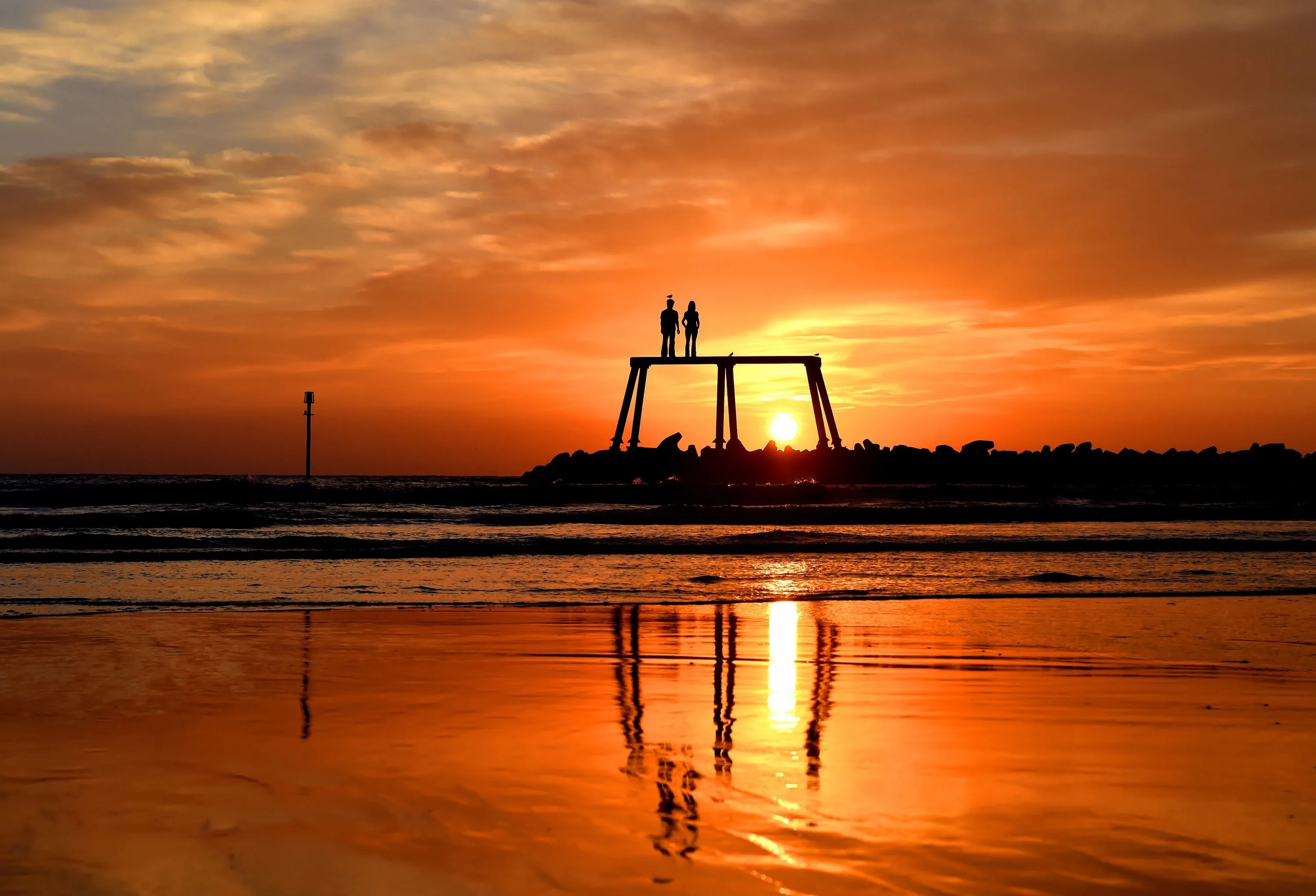 The sun rises over the north sea as The Couple by artist Sean Henery sits just of the coast at Newbiggin-by-the-Sea, England, Wednesday October 8, 2014. (Photo by Owen Humphreys/AP Photo/PA Wire)