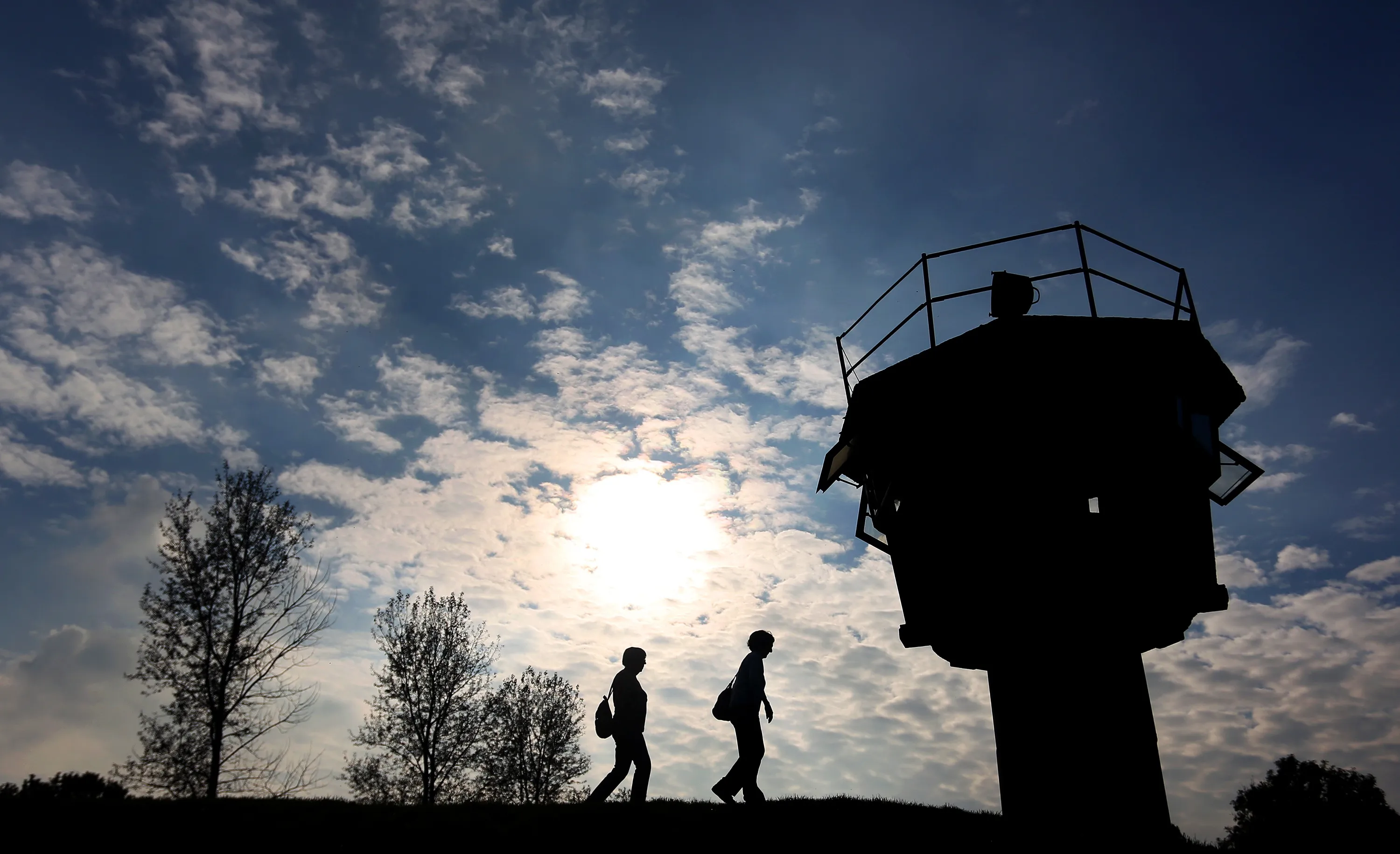 Visitors walk along a watchtower of the former German Democratic Republic (GDR) in Hoetensleben, eastern Germany, on October 2, 2014. This year Germany marks the 25th anniversary of the fall of the German-German border, that fell in November 1989. (Photo by Ronny Hartmann/AFP Photo)