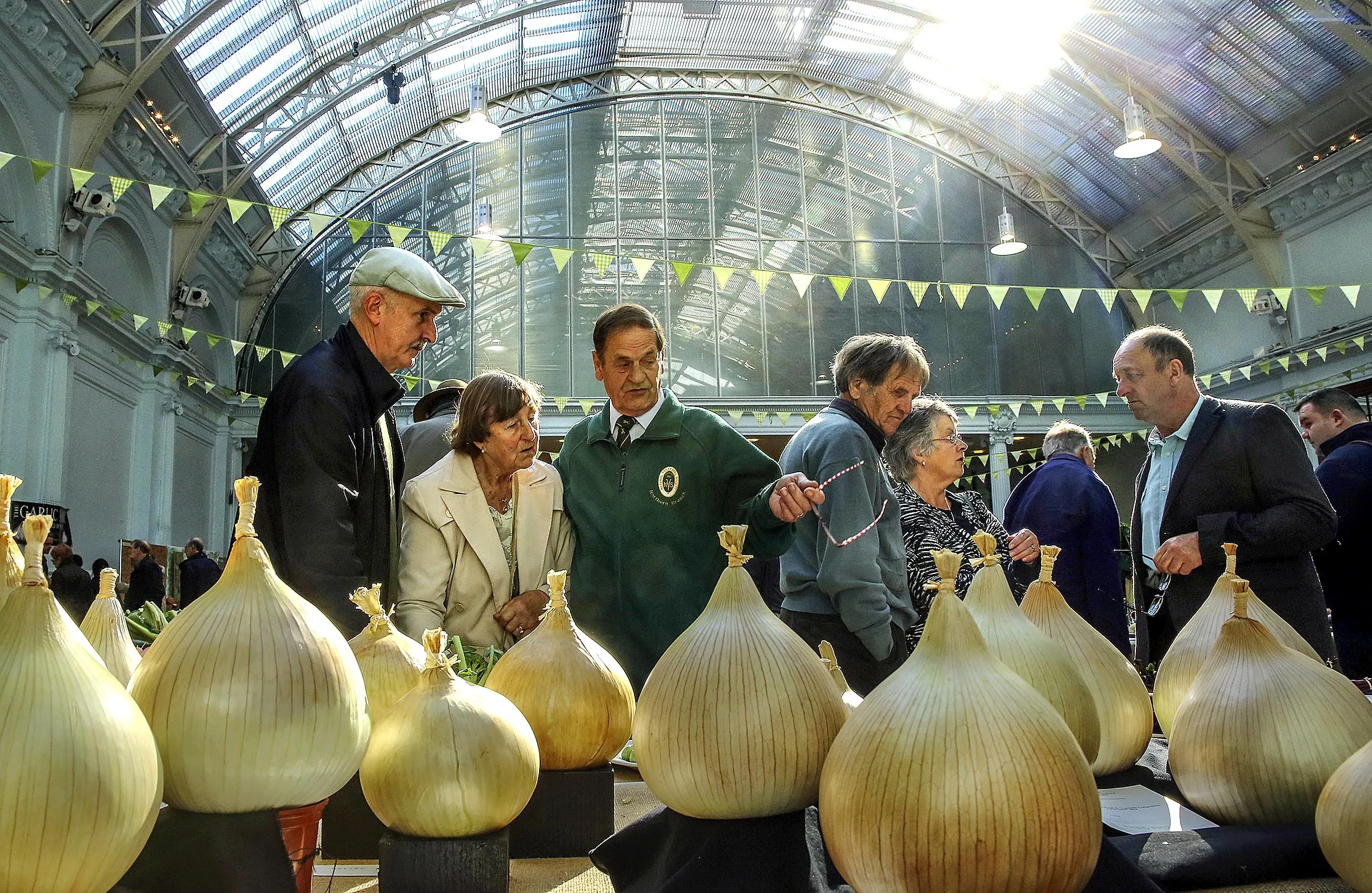 People look at onions on display at the RHS London Harvest Festival Show, on October 7, 2014. Growers from across the UK come together for the show to exhibit their bounty in the annual fruit and vegetable competition. (Photo by Dan Kitwood/Getty Images)