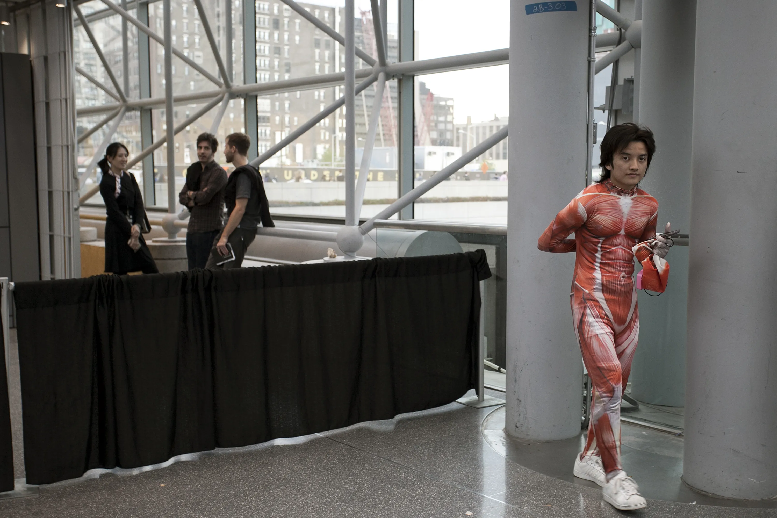 An attendee dressed as a titan from the anime series “Attack on Titan” inside New York's Comic-Con convention. (Photo by Siemond Chan)