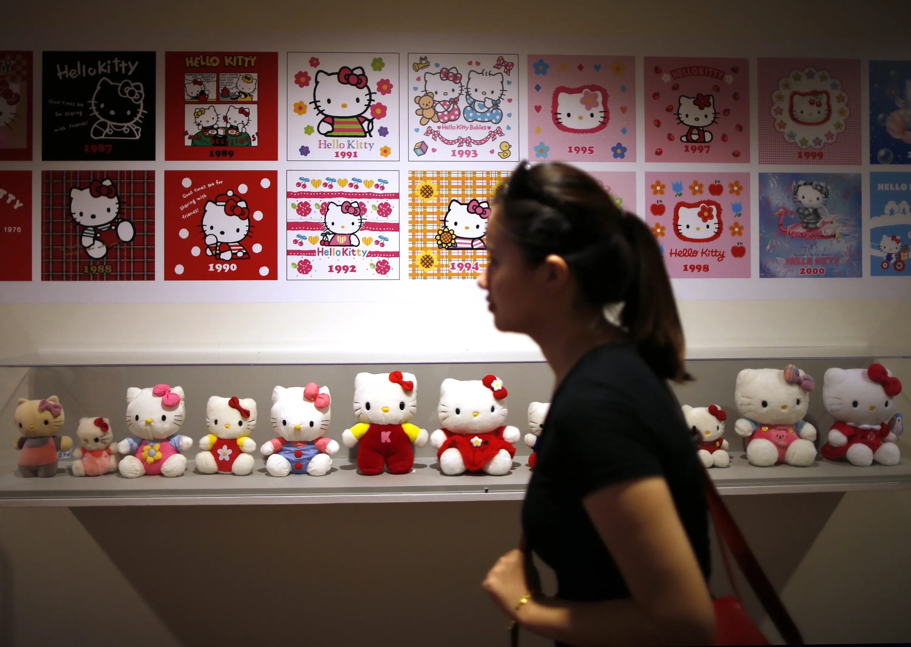 A woman walks past a display case at the “Hello! Exploring the Supercute World of Hello Kitty” museum exhibit in honor of Hello Kitty's 40th anniversary, at the Japanese American National Museum in Los Angeles, California October 10, 2014. (Photo by Lucy Nicholson/Reuters)