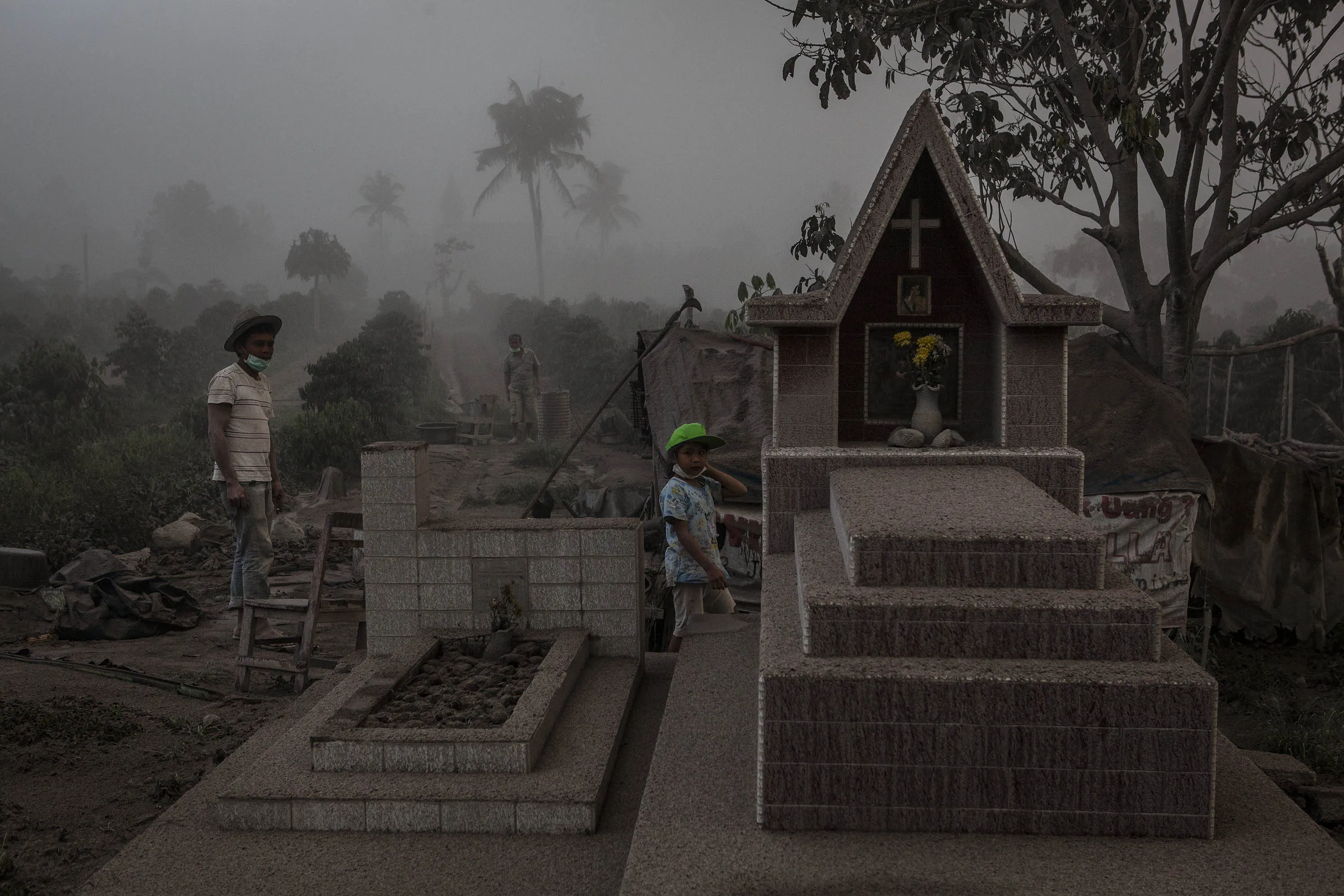 Villagers stand on their fields as their village is hit by ash from the eruption of Mount Sinabung on October 13, 2014 in Berastagi, Karo district, North Sumatra, Indonesia. (Photo by Ulet Ifansasti/Getty Images)