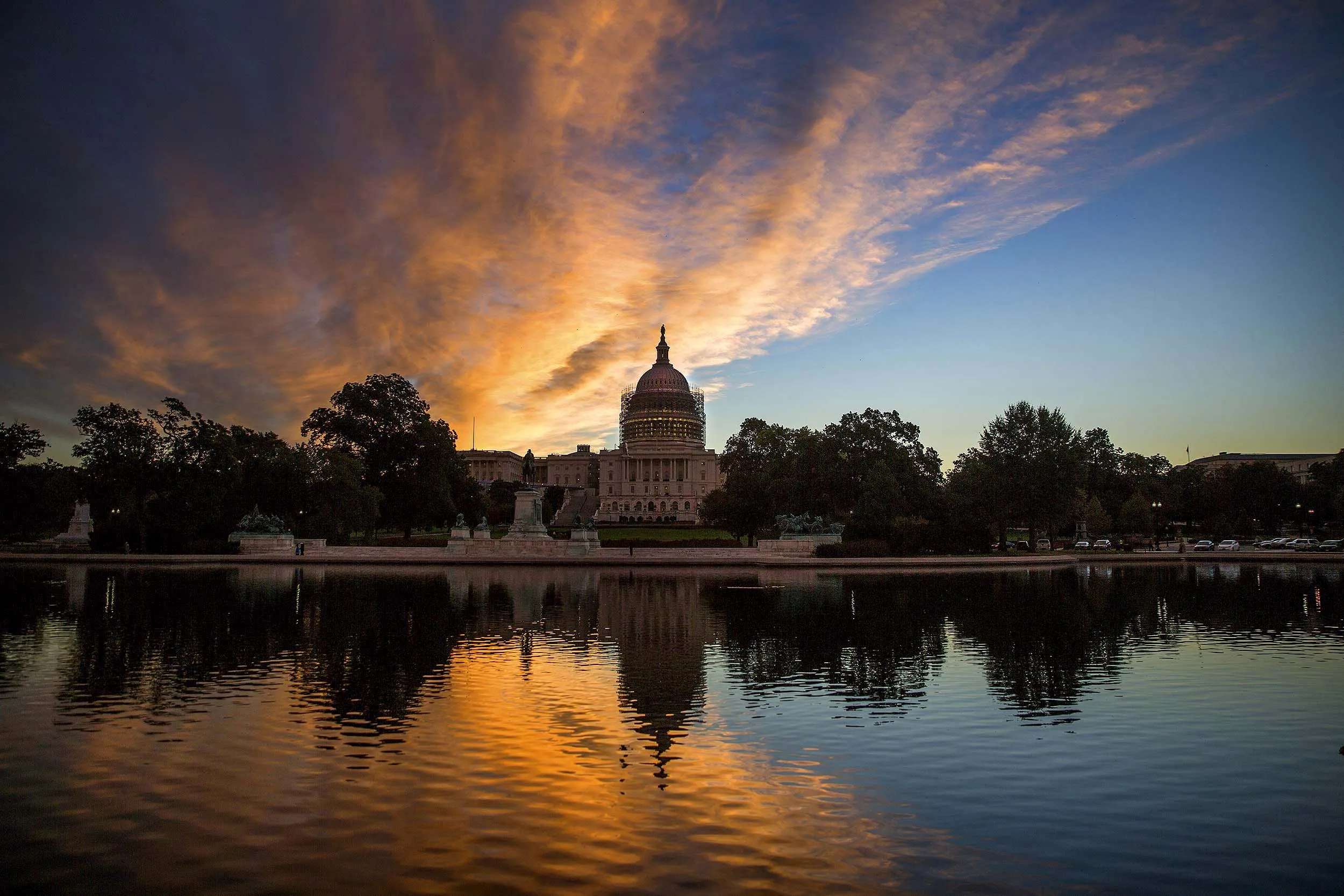 The U.S. Capitol building, with scaffolding around its dome as part of a restoration project, is seen at sunrise in Washington, on October 9, 2014. (Photo by Doug Mills/The New York Times)