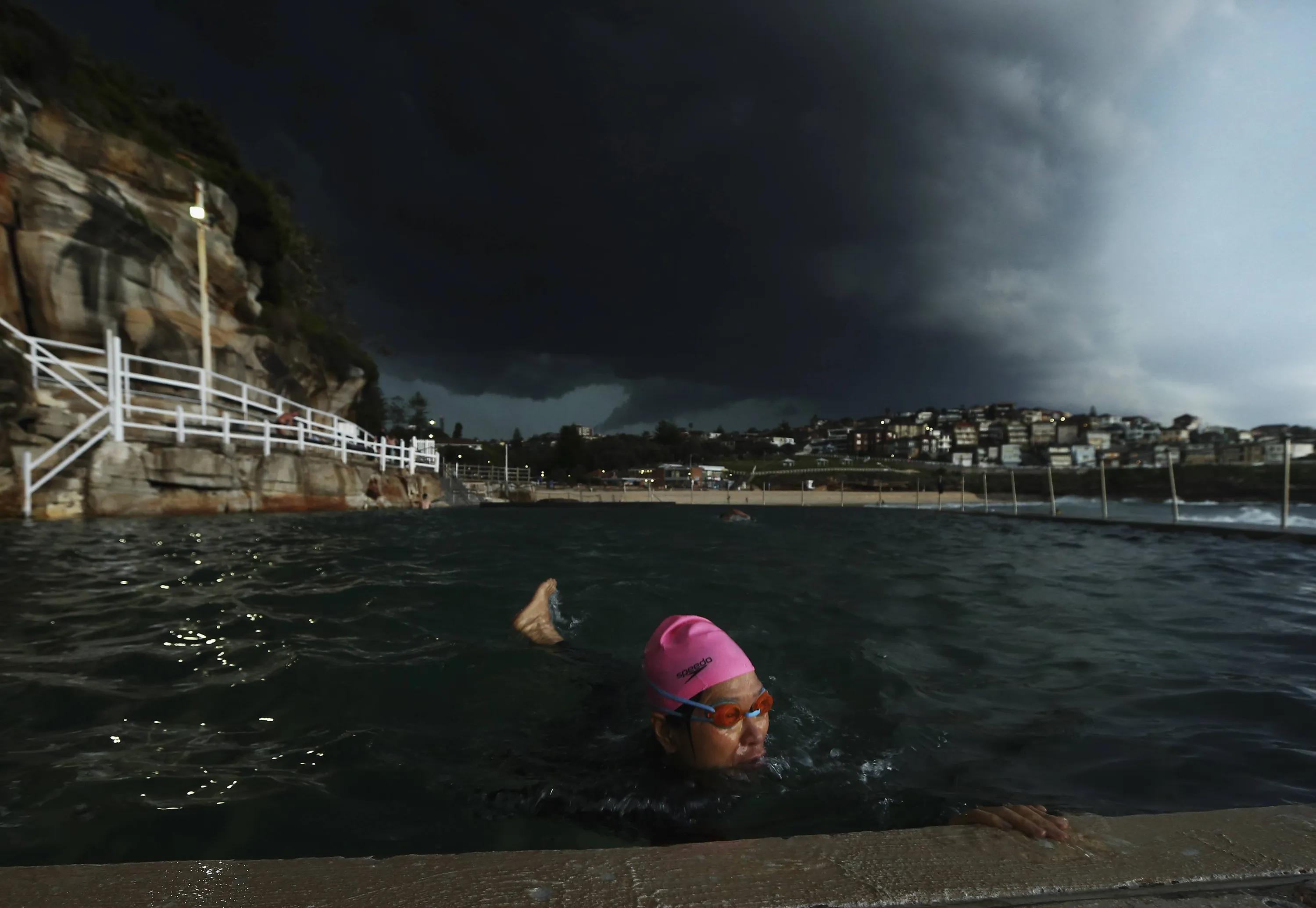A swimmer swims laps in Bronte Ocean Pool as a severe storm hits Sydney at Bronte Beach on October 13, 2014 in Sydney, Australia. (Photo by Ryan Pierse/Getty Images)