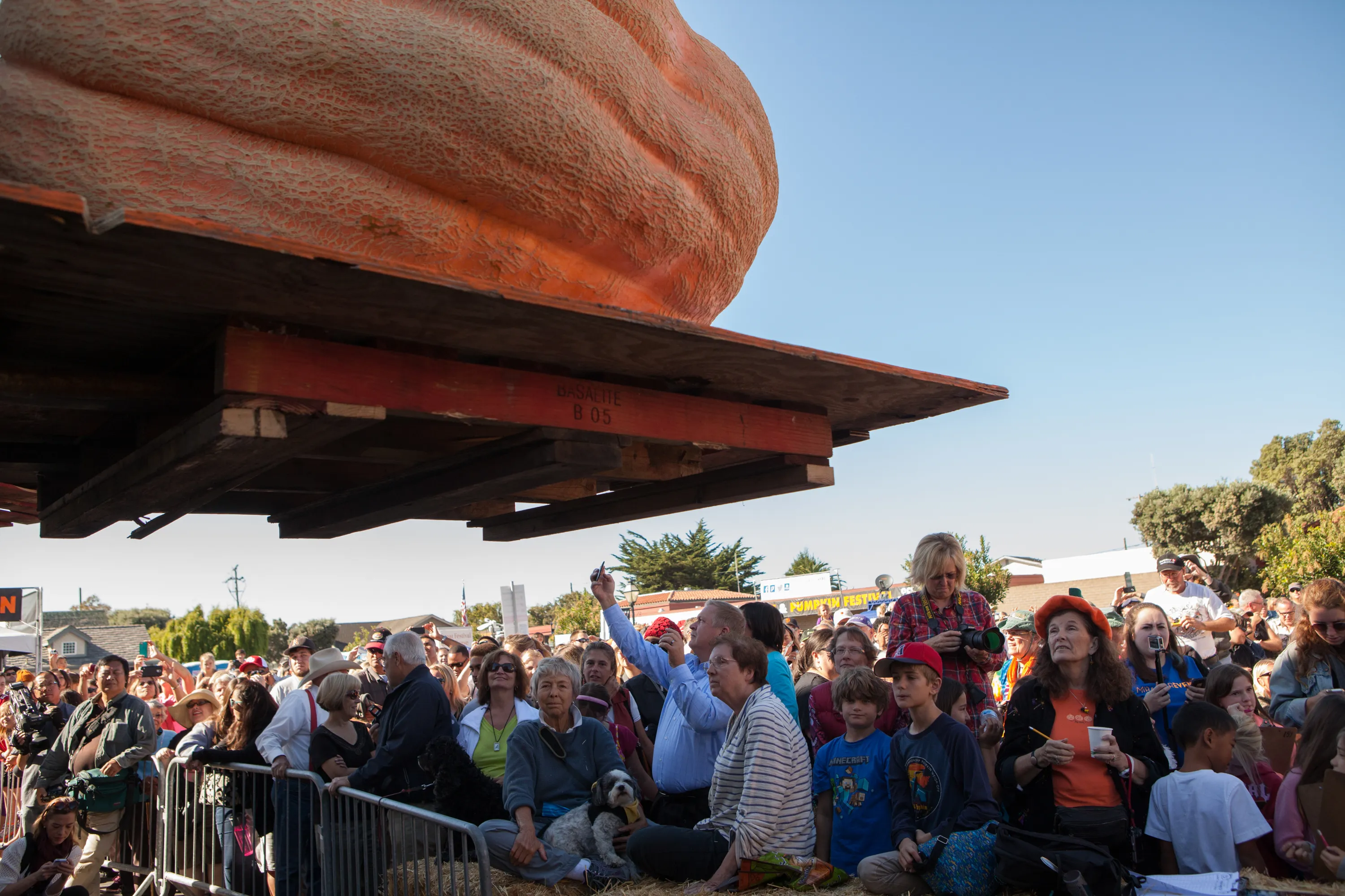 Entrants in the prettiest pumpkin category are lifted into the air for the crowd at the 41st Annual Safeway World Championship Pumpkin Weigh-Off in Half Moon Bay, Calif., Monday, October 13, 2014. Later in the day a 2,058 lb. pumpkin grown by John Hawkley took first place and set a new North American record. (Photo by Alex Washburn/AP Photo)