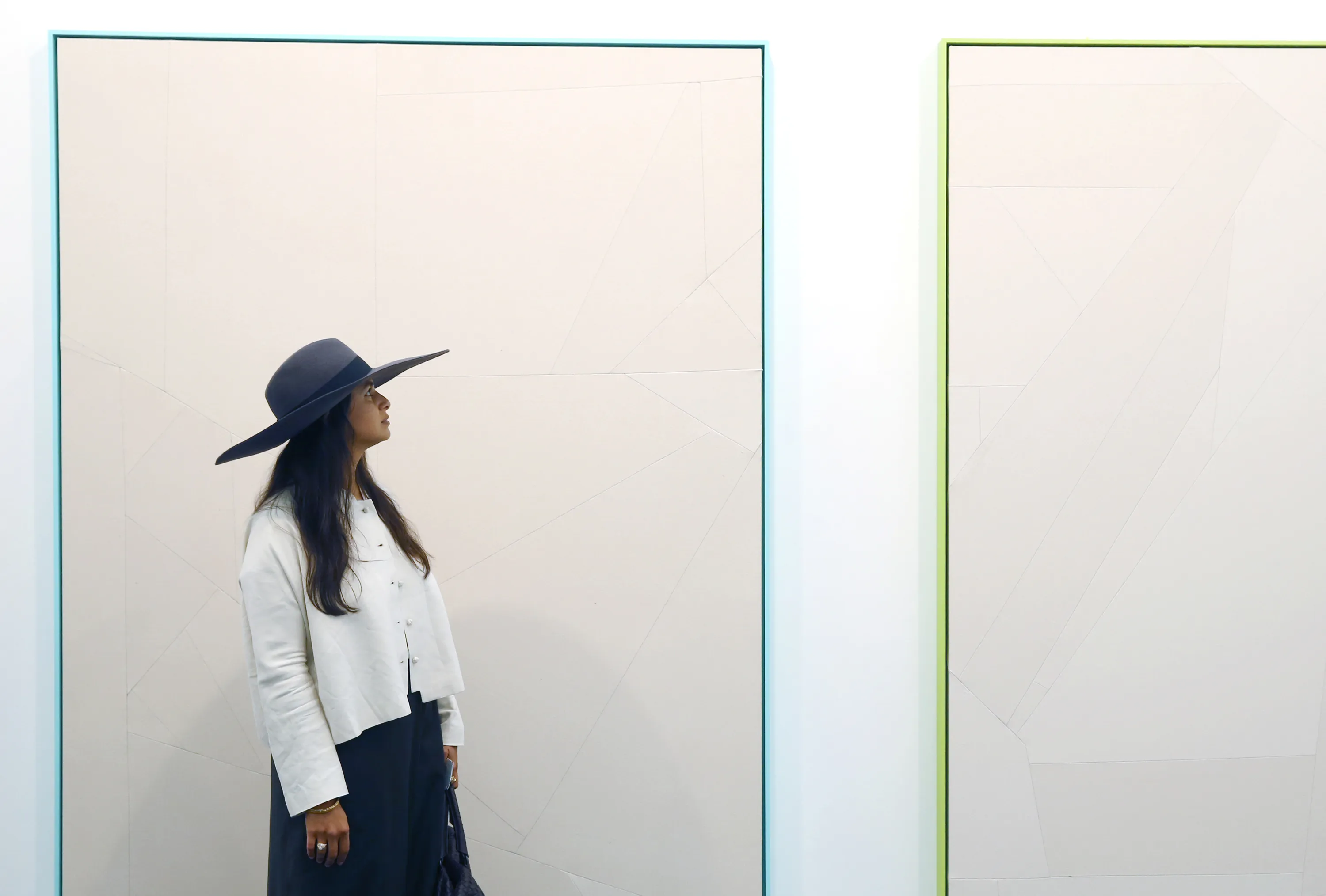 A visitor poses with untitled works by artist Sarah Crowner at the Frieze Art Fair in London, October 14, 2014. (Photo by Luke MacGregor/Reuters)