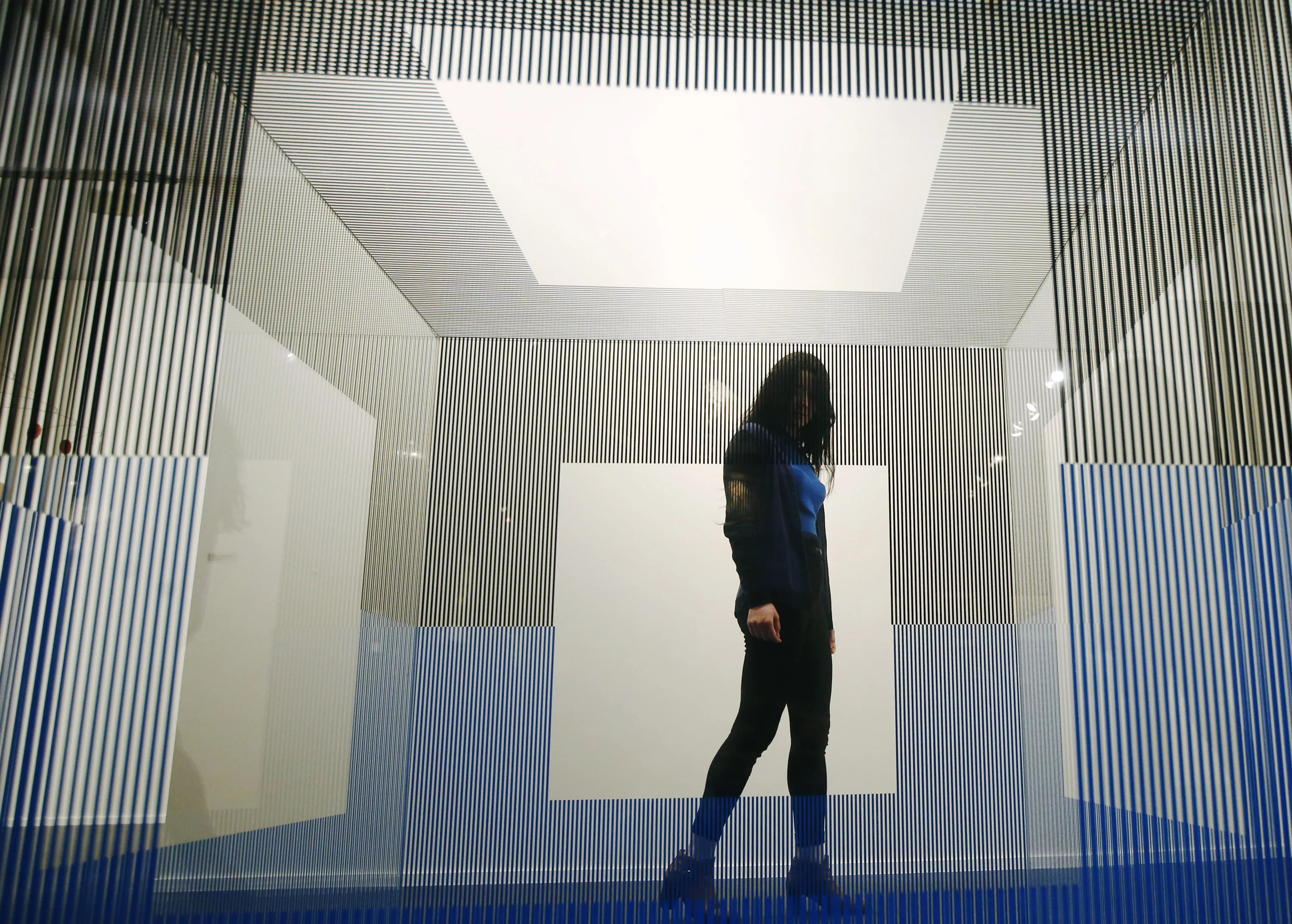 A visitor poses with artist Jesus R. Soto's artwork “Cubo de Roma” at the Frieze Masters in London, October 14, 2014. (Photo by Luke MacGregor/Reuters)