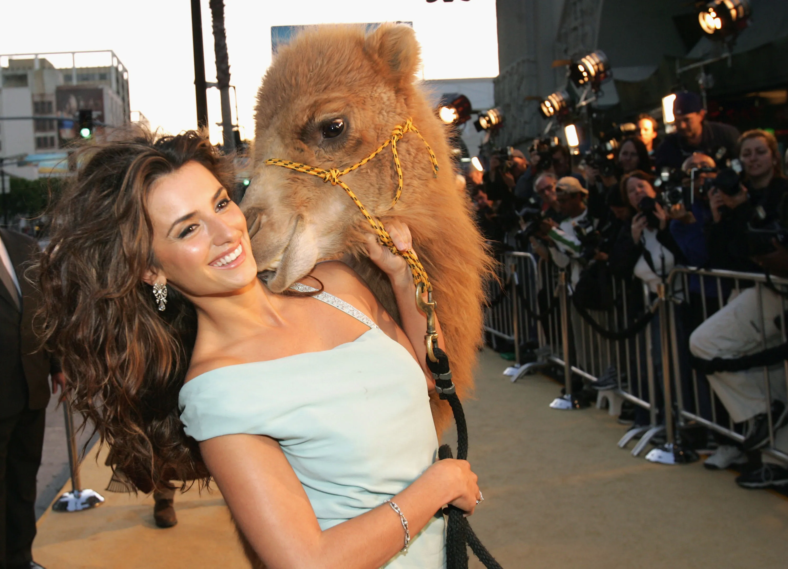 Actress Penelope Cruz walks a camel down the carpet at the premiere of the film “Sahara” on April 4, 2005 at Grauman's Chinese Theatre in Hollywood, California. (Photo by Vince Bucci/Getty Images)