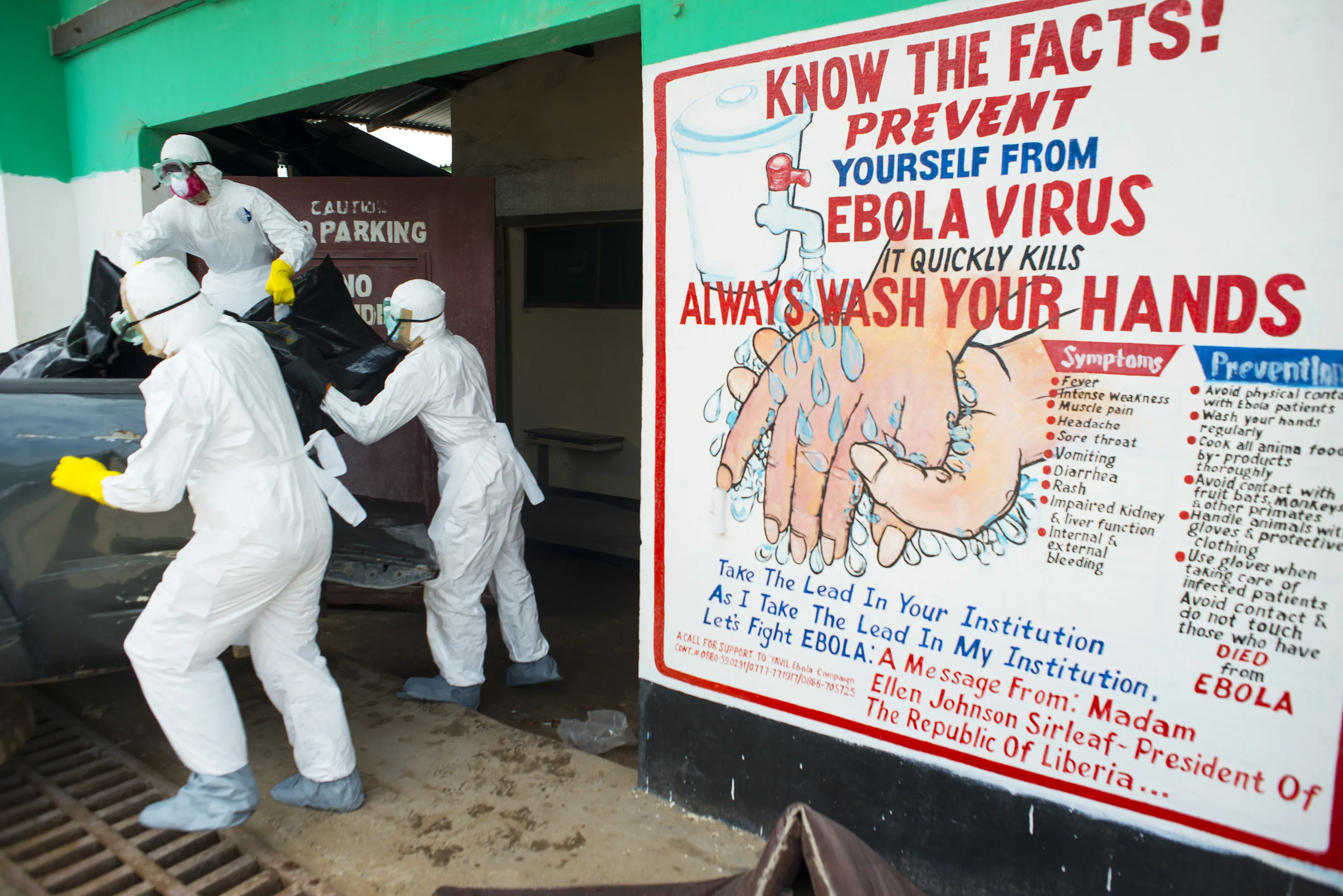 Liberian Health workers load six dead bodies of people who died from Ebola into the back of a pickup truck outside the Redemption Hospital on Saturday September 13, 2014 in Monrovia, Liberia. (Photo by Michel du Cille/The Washington Post)