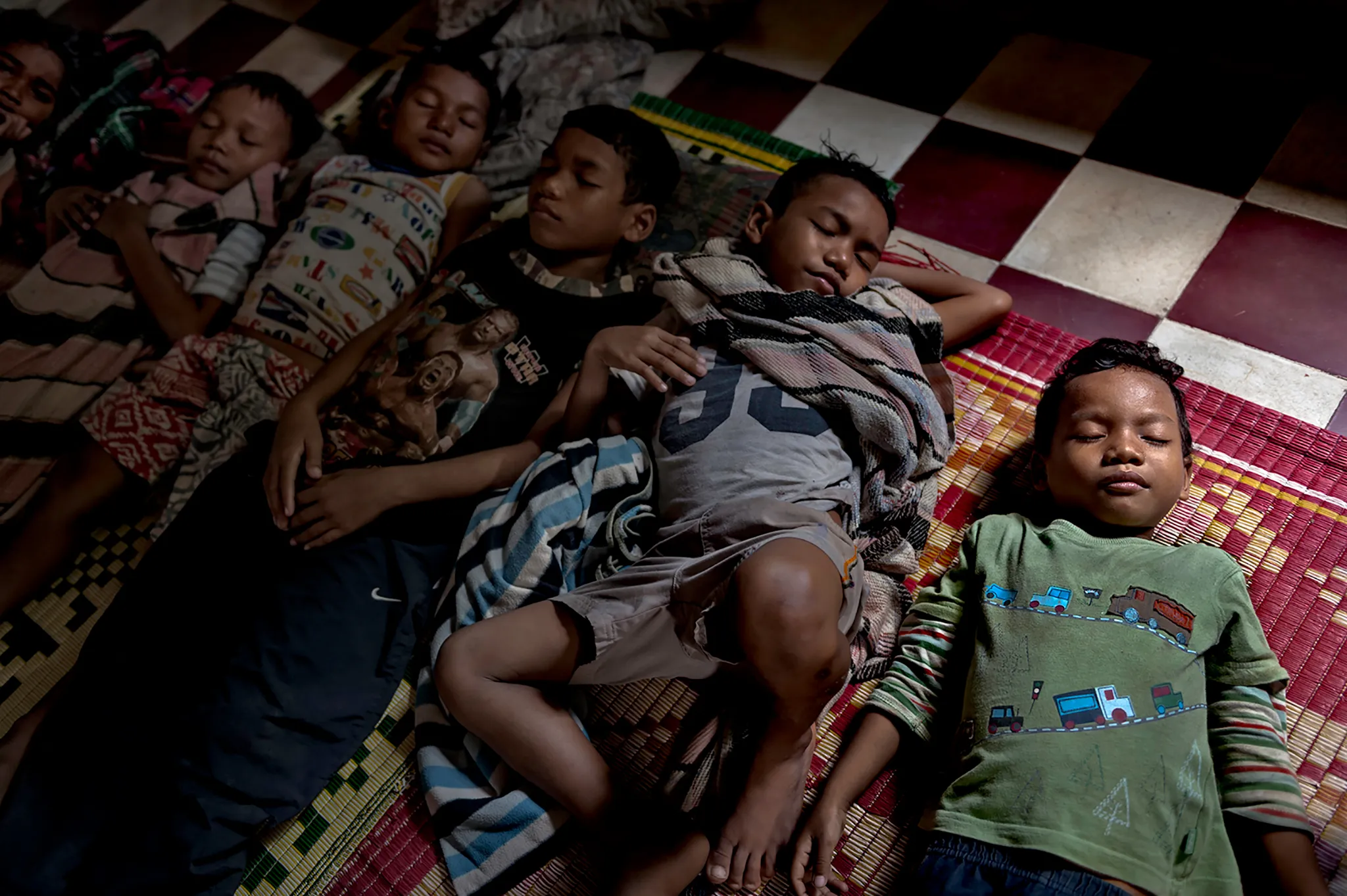 Five brothers, ranging in age from 5 to 12, sleep together on the floor at At the Krousa Thmey Center, a temporary orphanage. The shelter serves as a safe house for children who have been abandoned and found wandering the streets. Space is limited, so the children cannot stay for long, but they are offered temporary refuge from the influences of the city streets. Phnom Penh, Cambodia. (Photo by Renée C. Byer/Living on a Dollar a Day)