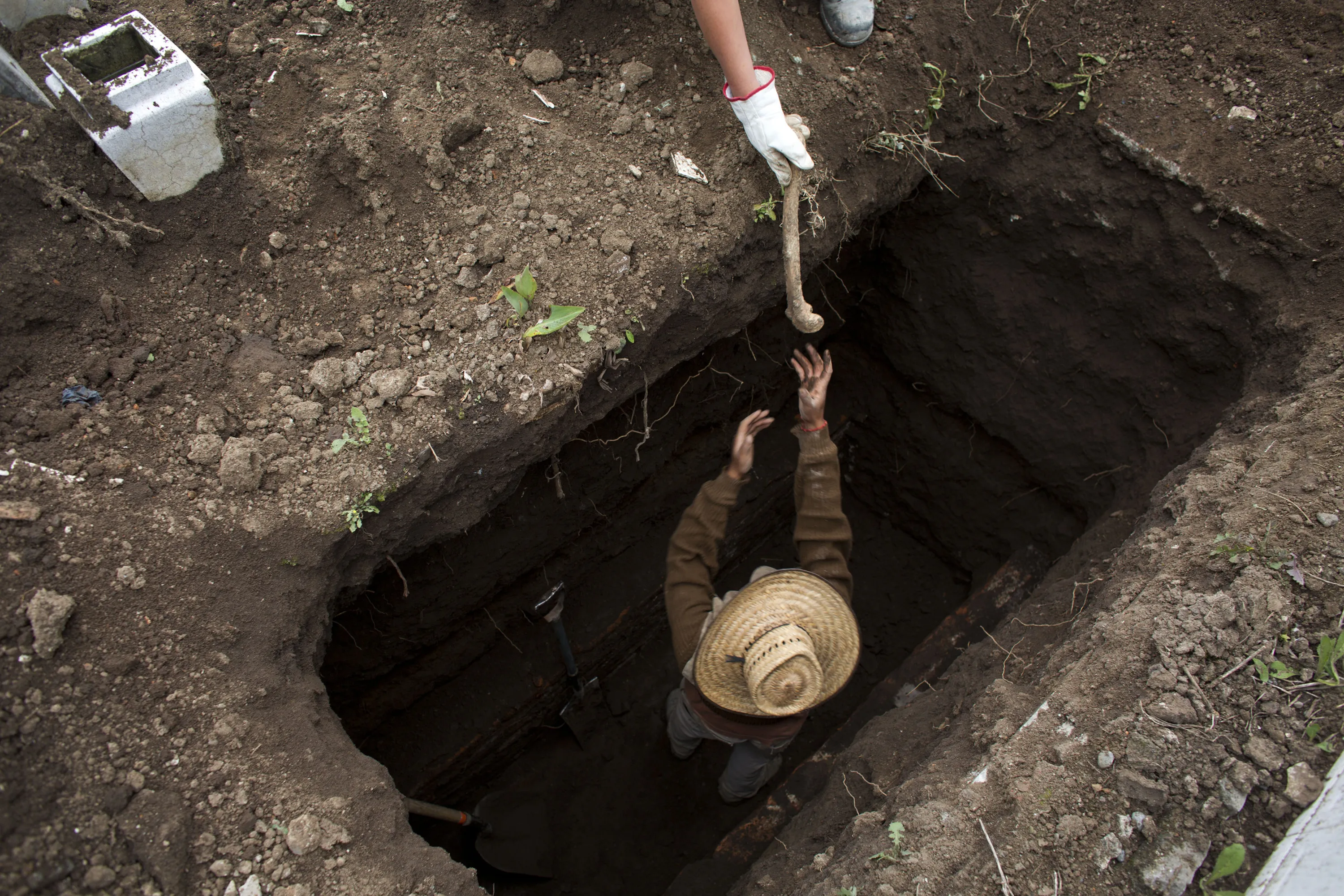 In this Oct. 14, 2014 photo, gravediggers remove unmarked loose bones from the bottom of a grave as they prepare it for a fresh burial, after removing more recent remains from a coffin for delivery to the family in Mexico City. With cemeteries rapidly reaching capacity in one of the world's biggest cities, families are forced to exhume and remove their relative's remains after a period of several years. (AP Photo/Rebecca Blackwell)