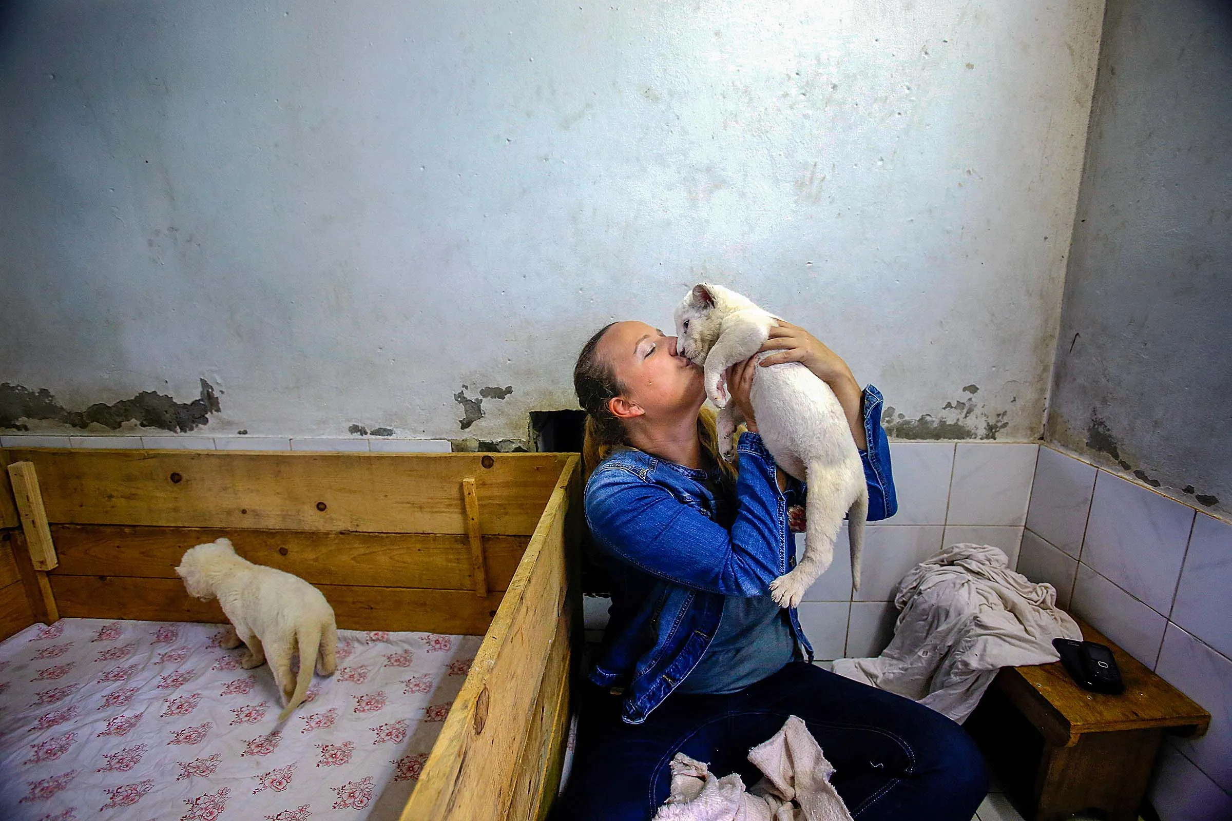 Zookeeper Nadezda Radovic kisses a three week old white lion cub at Belgrade Zoo in Serbia. (Photo by Darko Vojinovic/AP Photo)