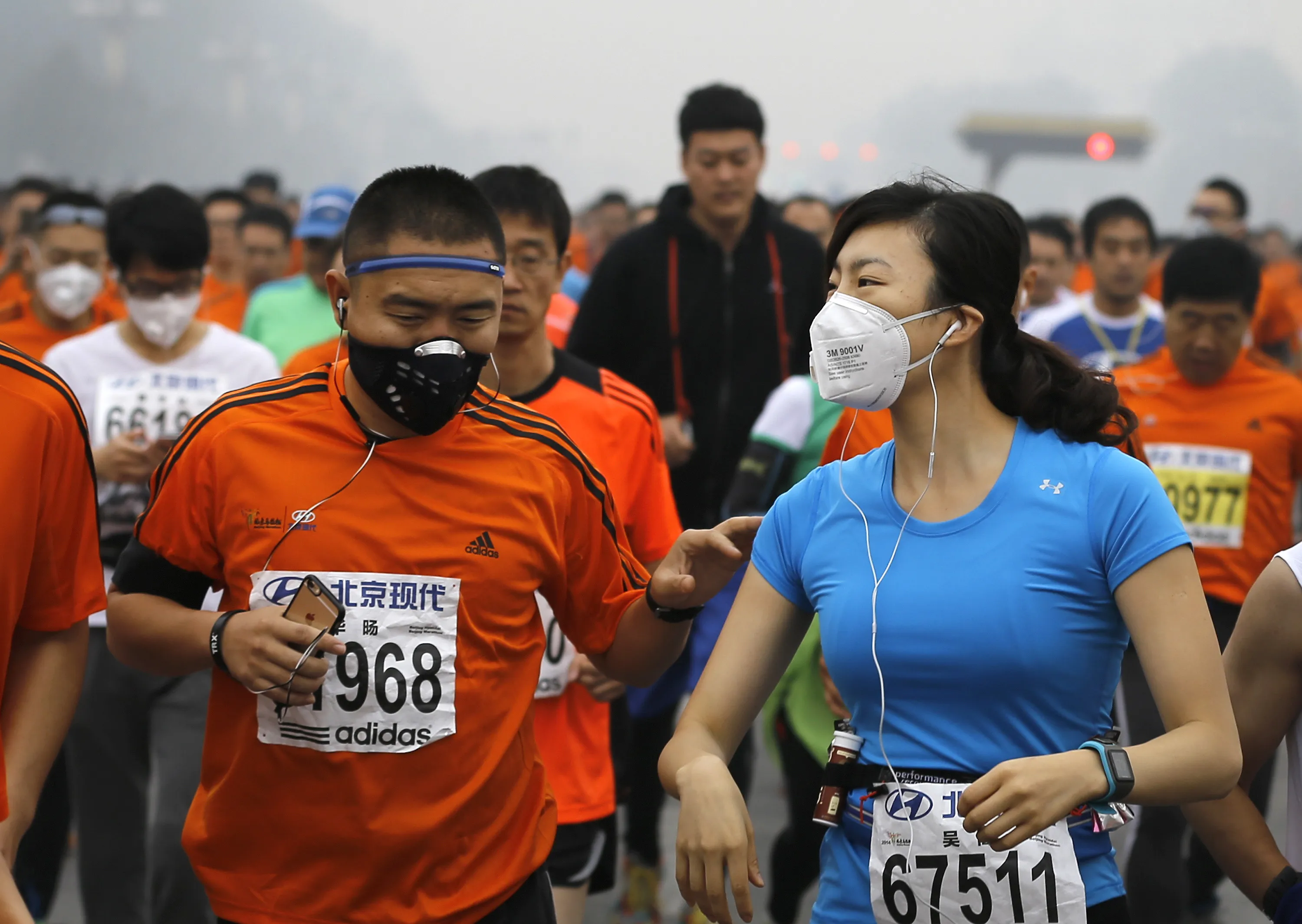 Runners wearing masks to protect themselves from pollutants jog past Chang'an Avenue near Tiananmen Square shrouded in haze while taking part in the 2014 Beijing International Marathon in Beijing, China Sunday, October 19, 2014. (Photo by Andy Wong/AP Photo)