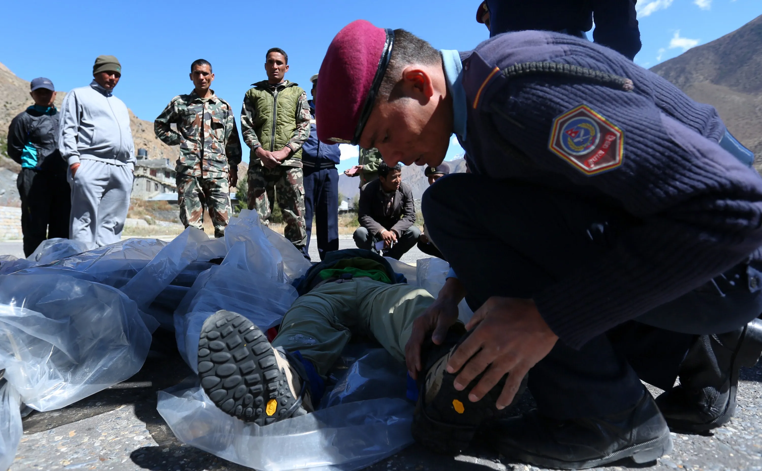 Nepalese police prepare to move the bodies of trekkers killed following a snowstorm and an avalanche onto a plane to be transported to Kathmandu in Jomsom on October 17, 2014. (Photo by Skanda Gautam/AFP Photo)