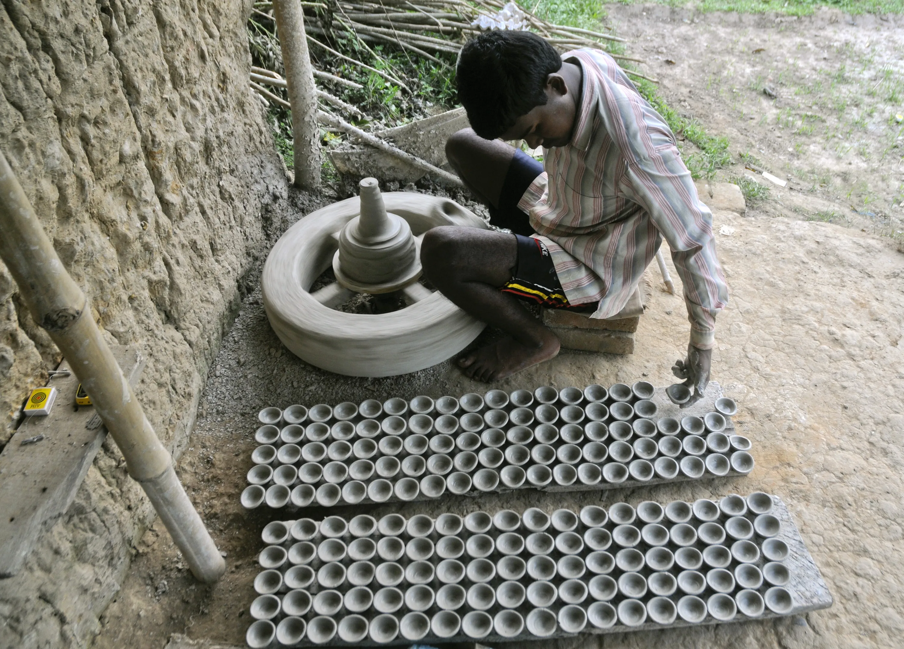 A potter makes clay lamps ahead of the Hindu festival of Diwali in Agartala, capital of Tripura, October 9, 2011. (Photo by Jayanta Dey/Reuters)
