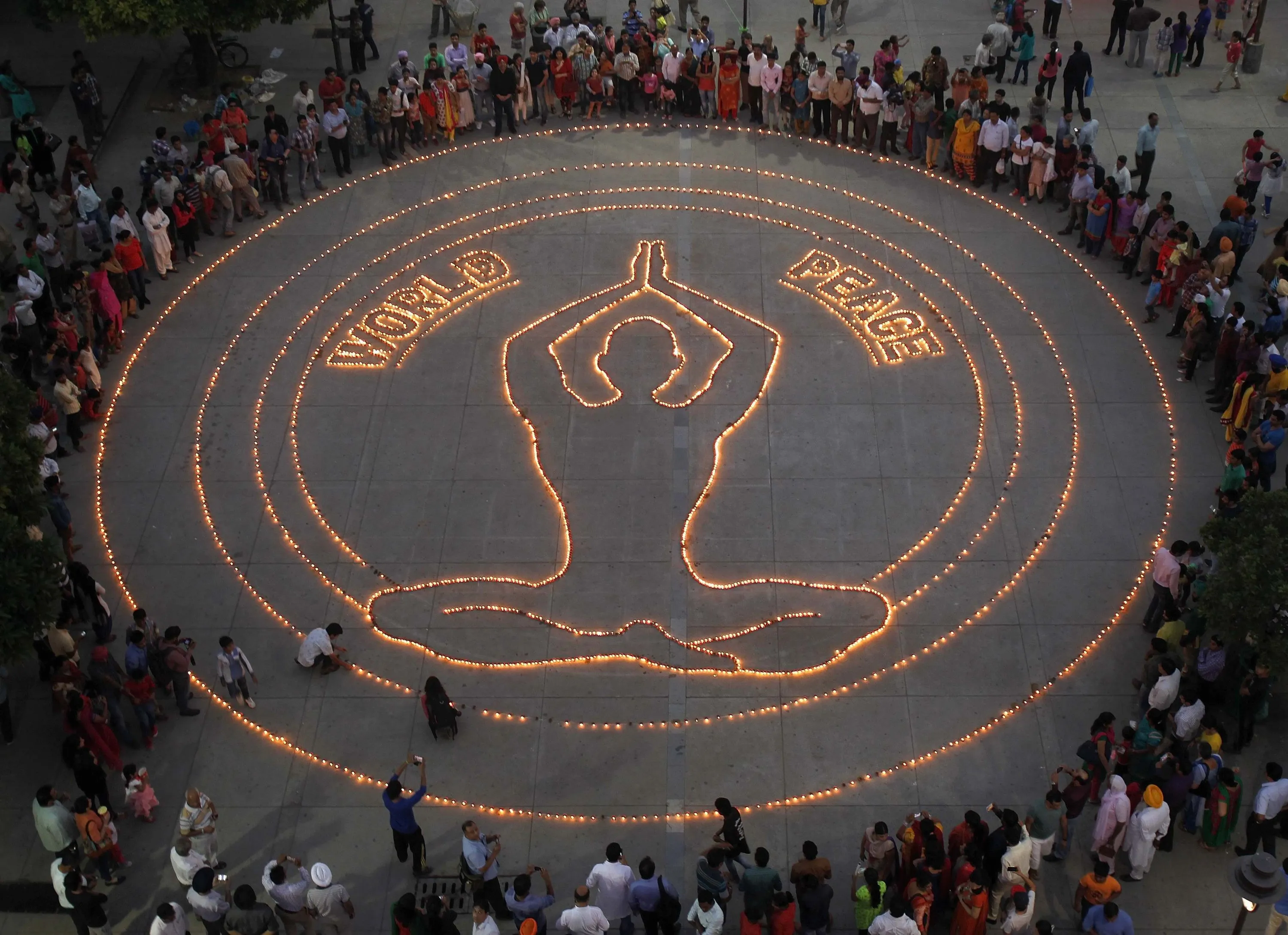 People light lamps and arrange them into a formation on the eve of Diwali in the northern Indian city of Chandigarh October 22, 2014. Earthen lamps were lit during a public ceremony for world peace in the city on Wednesday, organisers said. Lamps are traditionally used during Diwali, the annual Hindu festival of lights, to decorate homes. The festival is celebrated across the country on Thursday. (Photo by Ajay Verma/Reuters)
