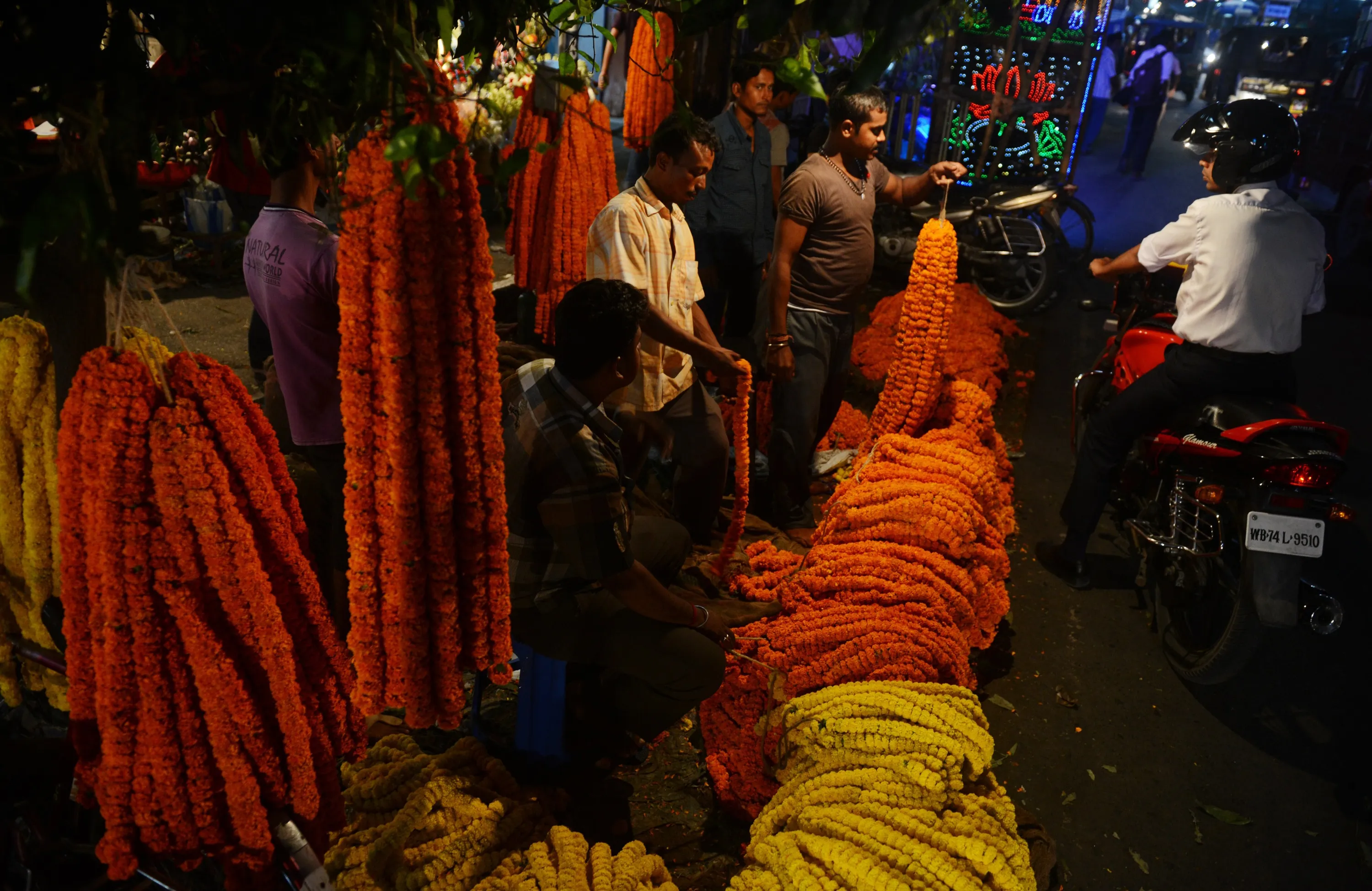 Indian flower sellers display garlands of marigolds to customers at a roadside stall ahead of the Hindu festival of Diwali in Siliguri on October 22, 2014. During Diwali, the Hindu festival of lights, people decorate their homes with flowers and light oil lamps in celebration of the festival which marks the homecoming of the god Lord Ram after vanquishing the demon King Ravana and returned to his kingdom Ayodhya. (Photo by Diptendu Dutta/AFP Photo)
