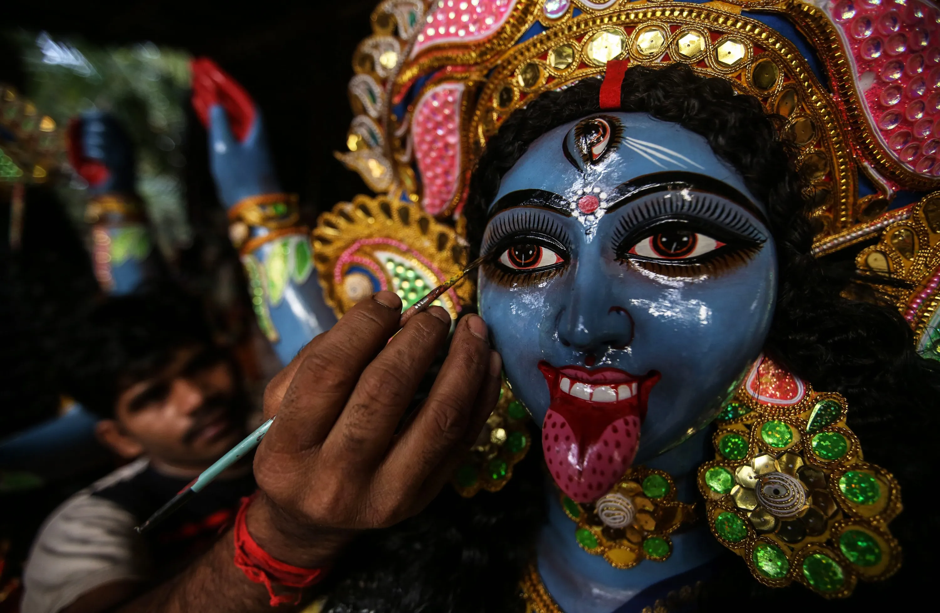 An Indian artist gives finishing touches to the idols of Goddess Kali at a local workshop ahead of Diwali festival, in Mumbai, India, 21 October 2014. Kali, the Goddess of Power, will be worshiped during Diwali festival. Diwali, the festival of lights symbolizing the victory of good over evil which commemorates Lord Ram's return to his kingdom Ayodhya after completing his 14-year exile. This year, Diwali will be celebrated in India on 23 October 2014. (Photo by Divyakant Solanki/EPA)
