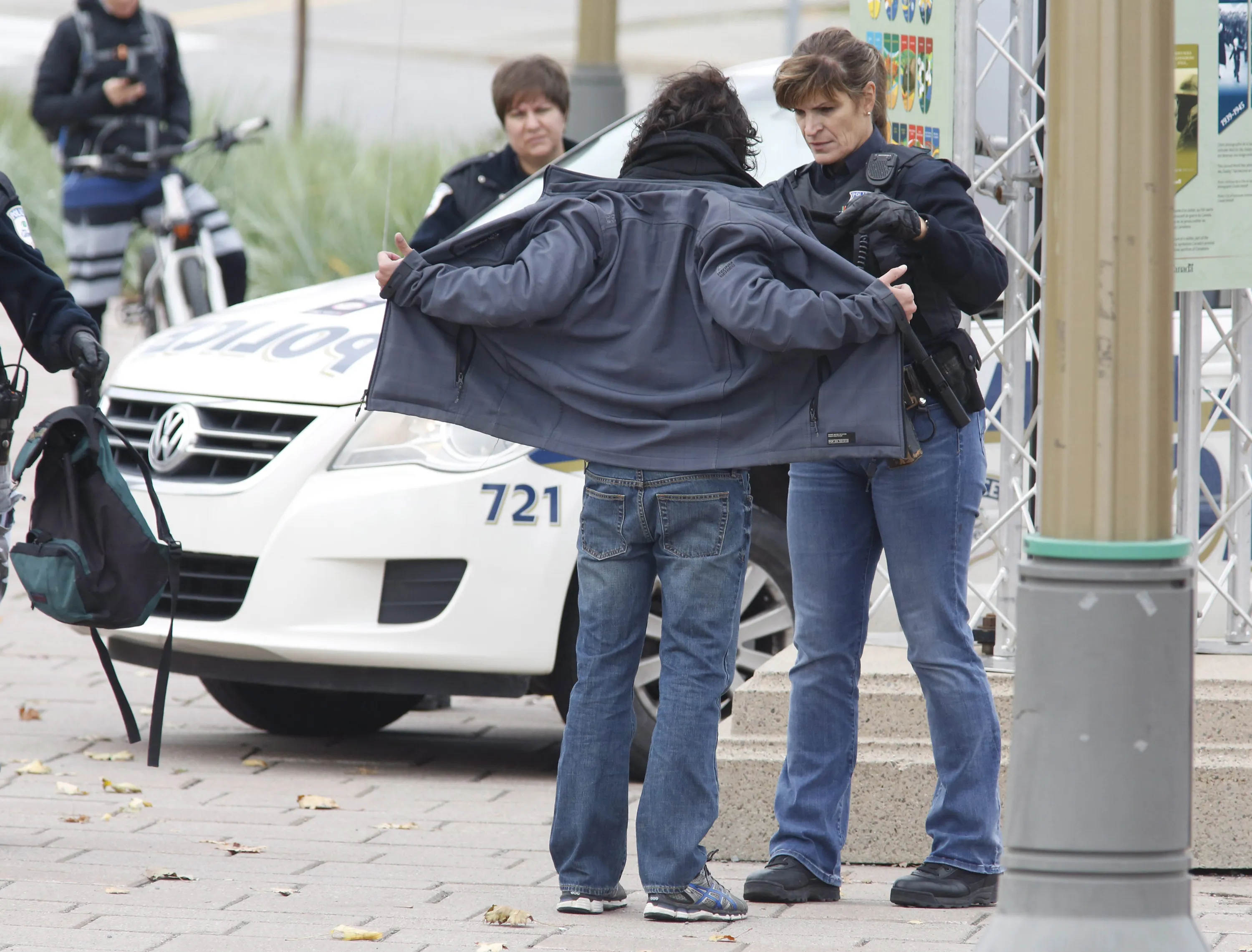 Police search cars and pedestrians as they leave the Alexandra Bridge and enter Gatineau, Quebec near the Parliament Buildings in Ottawa on Wednesday, October 22, 2014. (Photo by Patrick Doyle/AP Photo/The Canadian Press)