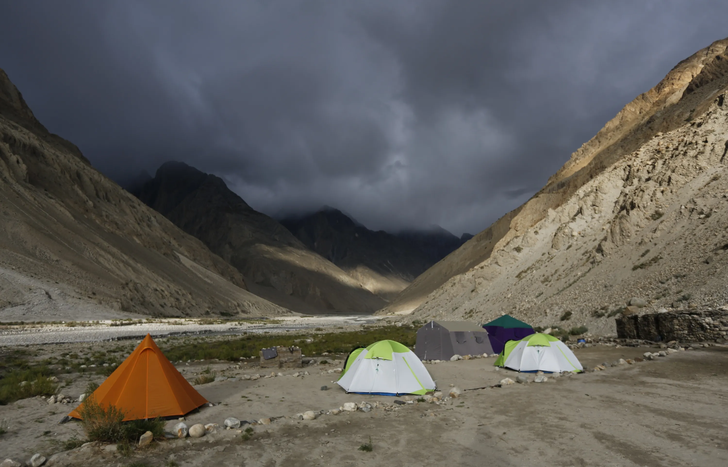 Tents stand under dark rain clouds in the valley of the river Braldu at Bardoumal near the Baltoro glacier in the Karakoram mountain range in Pakistan August 30, 2014. (Photo by Wolfgang Rattay/Reuters)