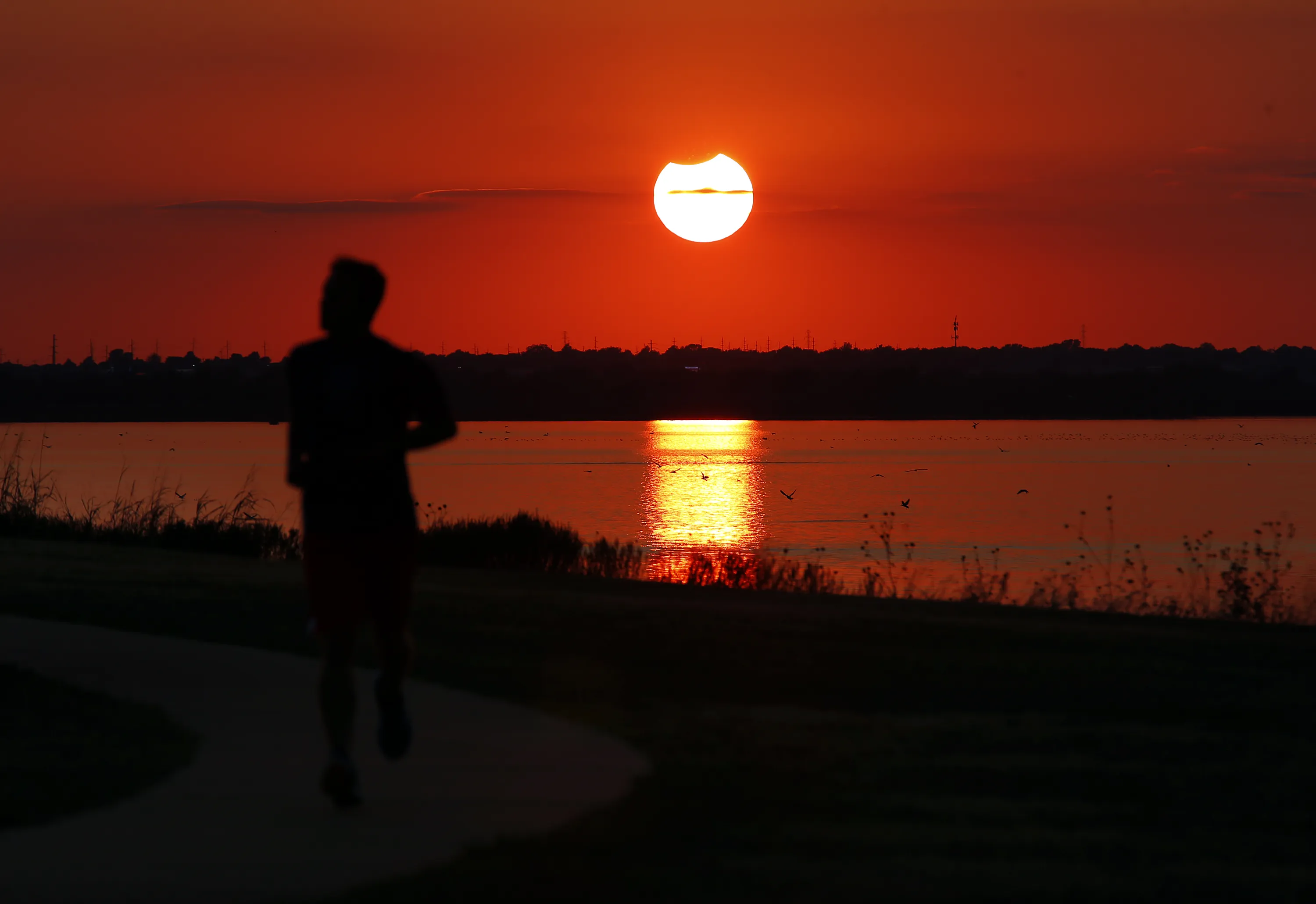 A jogger runs in front of the sun near the end of a partial solar eclipse at Lake Hefner in Oklahoma City, Thursday, October 23, 2014. (Photo by Sarah Phipps/AP Photo/The Oklahoman)