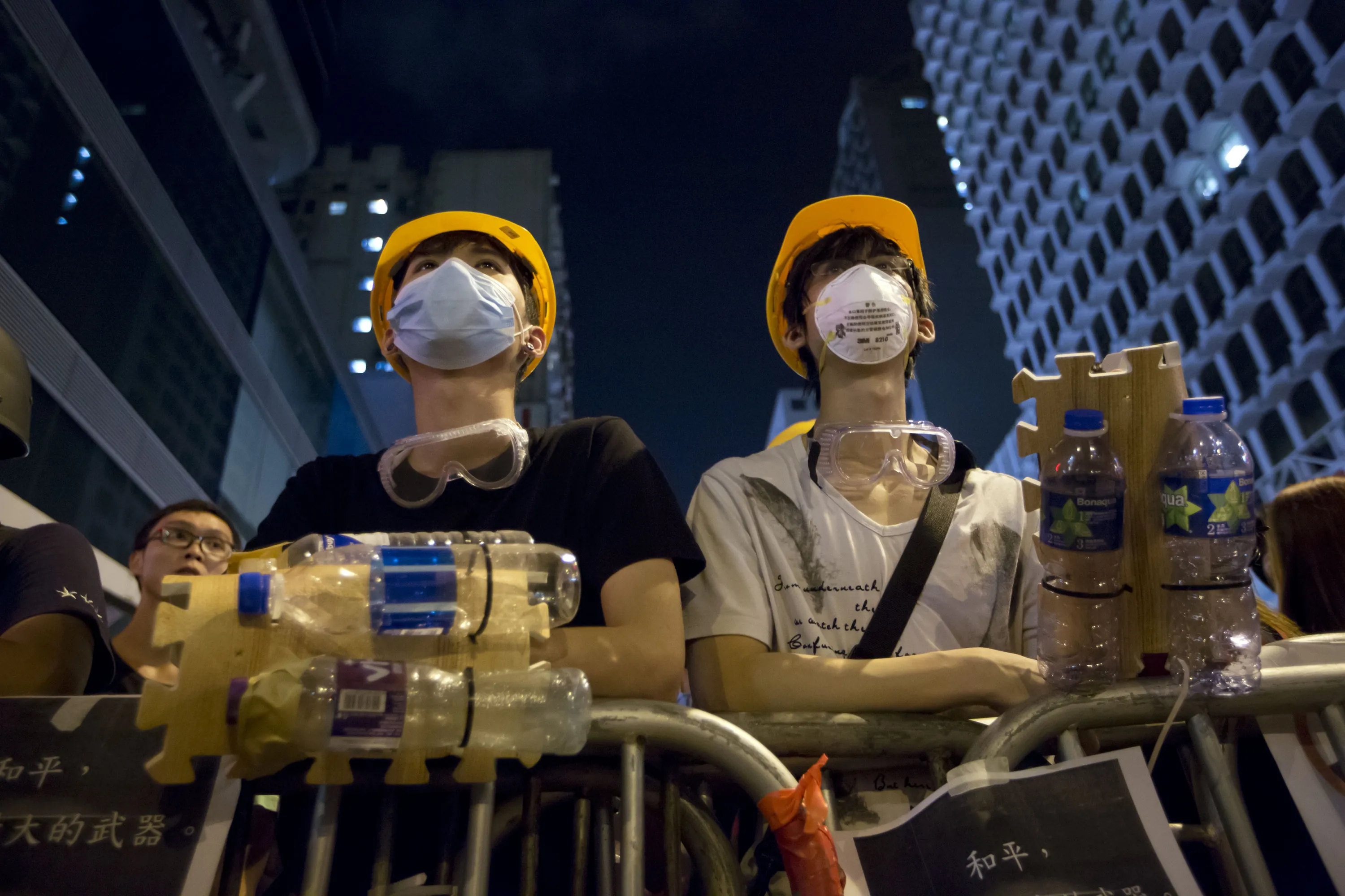 Protesters wear protective gear made by plastic bottle at a barricade in the Mong Kok district of Hong Kong, early Monday, October 20, 2014. Three weeks ago, students at a rally stormed a fenced-off courtyard outside Hong Kong's government headquarters, triggering unprecedented mass protests for greater democracy in the semiautonomous Chinese city. (Photo by Kin Cheung/AP Photo)