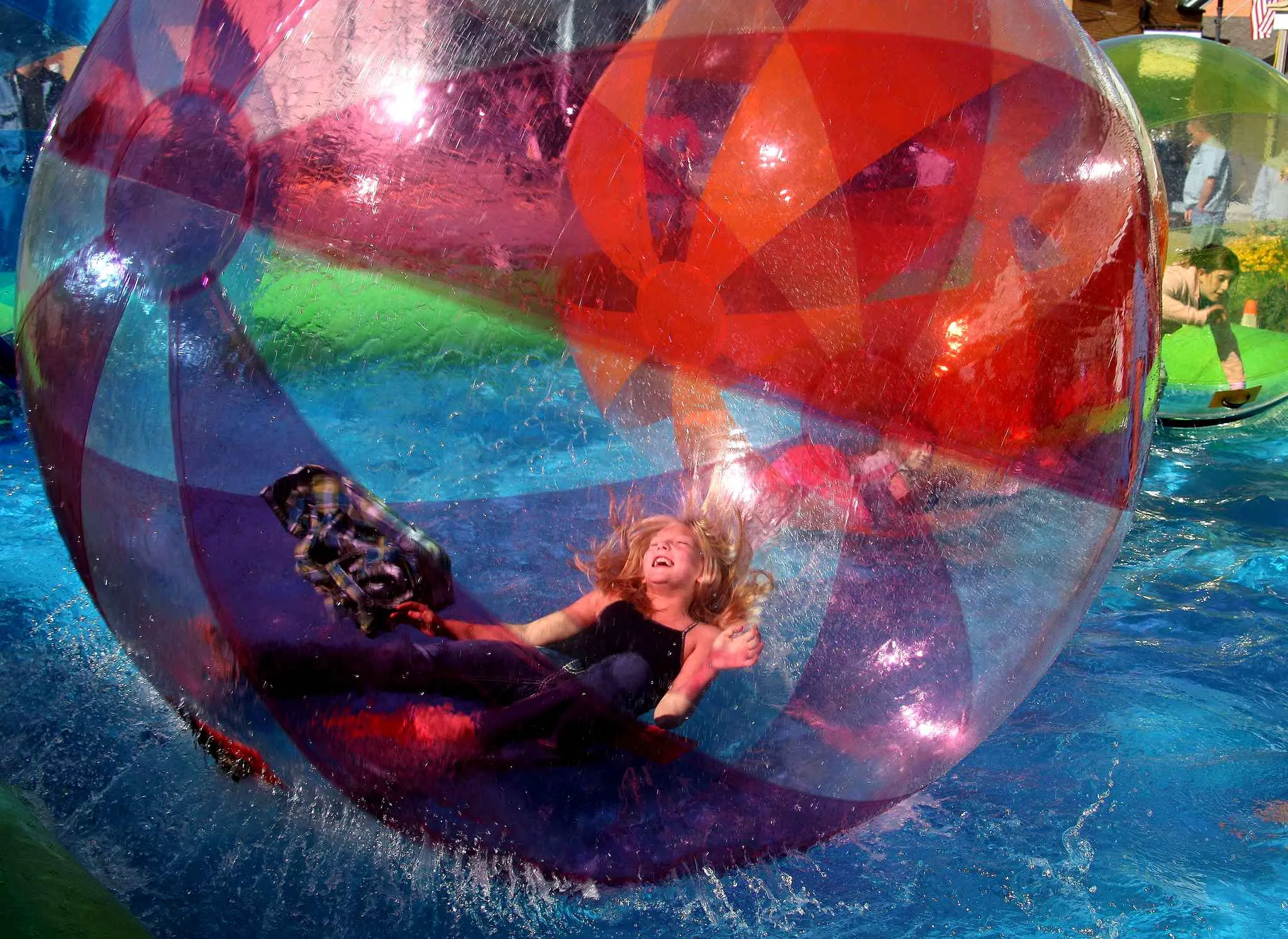 In this October 11, 2014 photo, Caylee jensen, 9, laughs while riding on the Wacky Water Walkerz attraction in Keosauqua, Iowa. The attraction was part of the Villages of Van Buren Scenic Drive Festival which concluded Sunday. (Photo by John Gaines/AP Photo/The Hawk Eye)