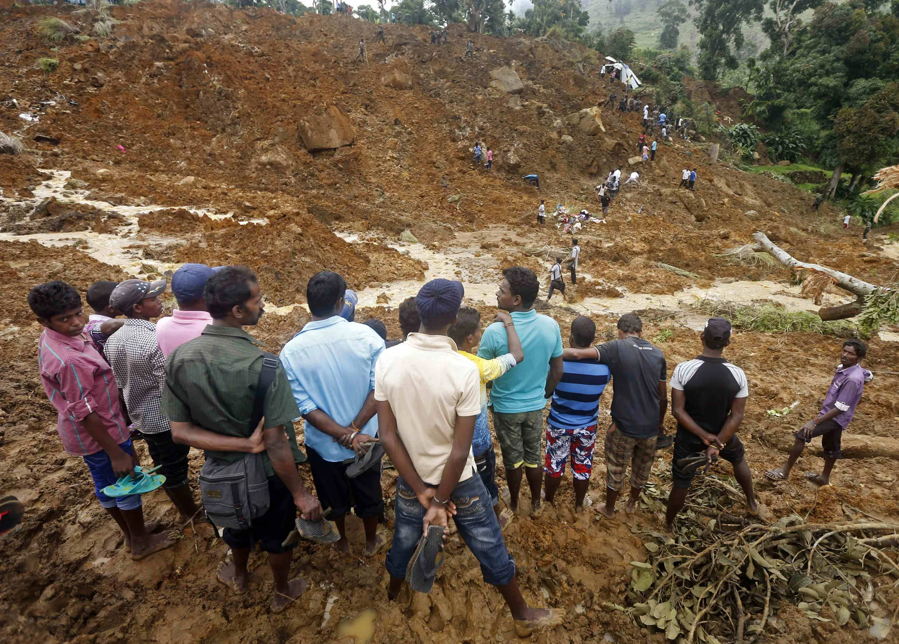 A group of men stand above the site of a landslide at the Koslanda tea plantation near Haldummulla October 30, 2014. (Photo by Dinuka Liyanawatte/Reuters)