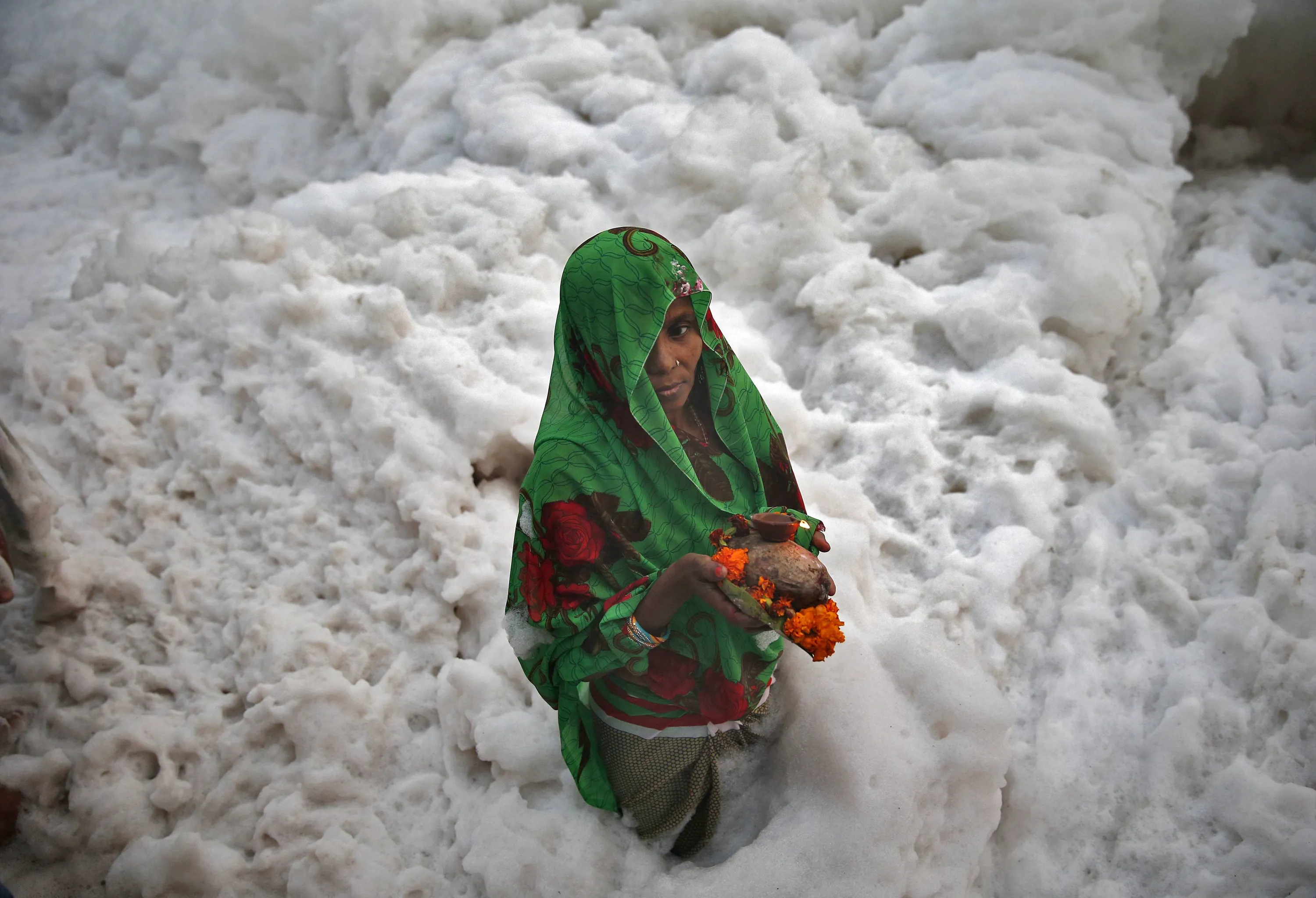 A Hindu woman worships the Sun god Surya in the polluted waters of the river Yamuna during the Hindu religious festival of Chatt Puja in New Delhi October 30, 2014. (Photo by Ahmad Masood/Reuters)