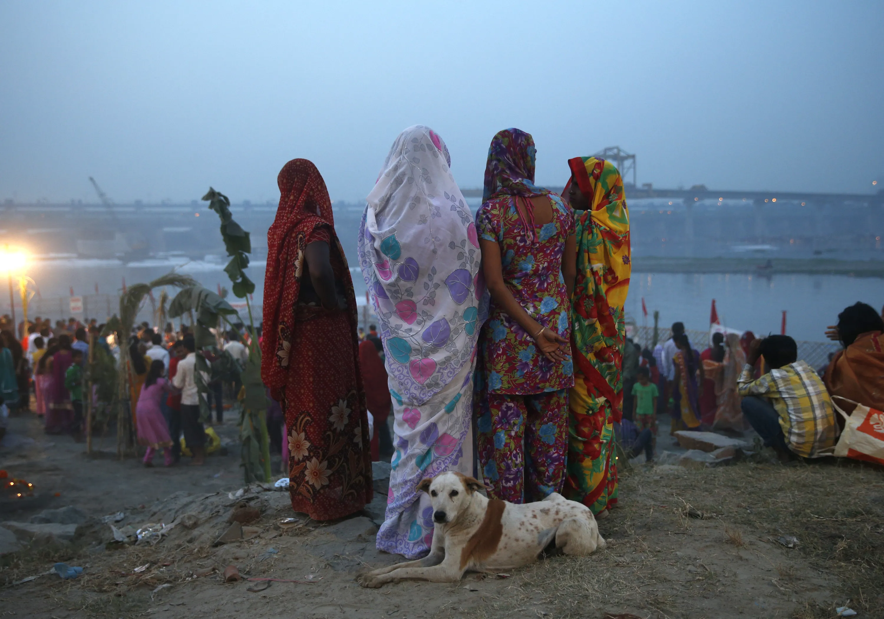 Hindu Women stand near a dog as they prepare to worship the Sun god Surya on the banks of the river Yamuna during the Hindu religious festival of Chatt Puja in New Delhi October 29, 2014. (Photo by Ahmad Masood/Reuters)