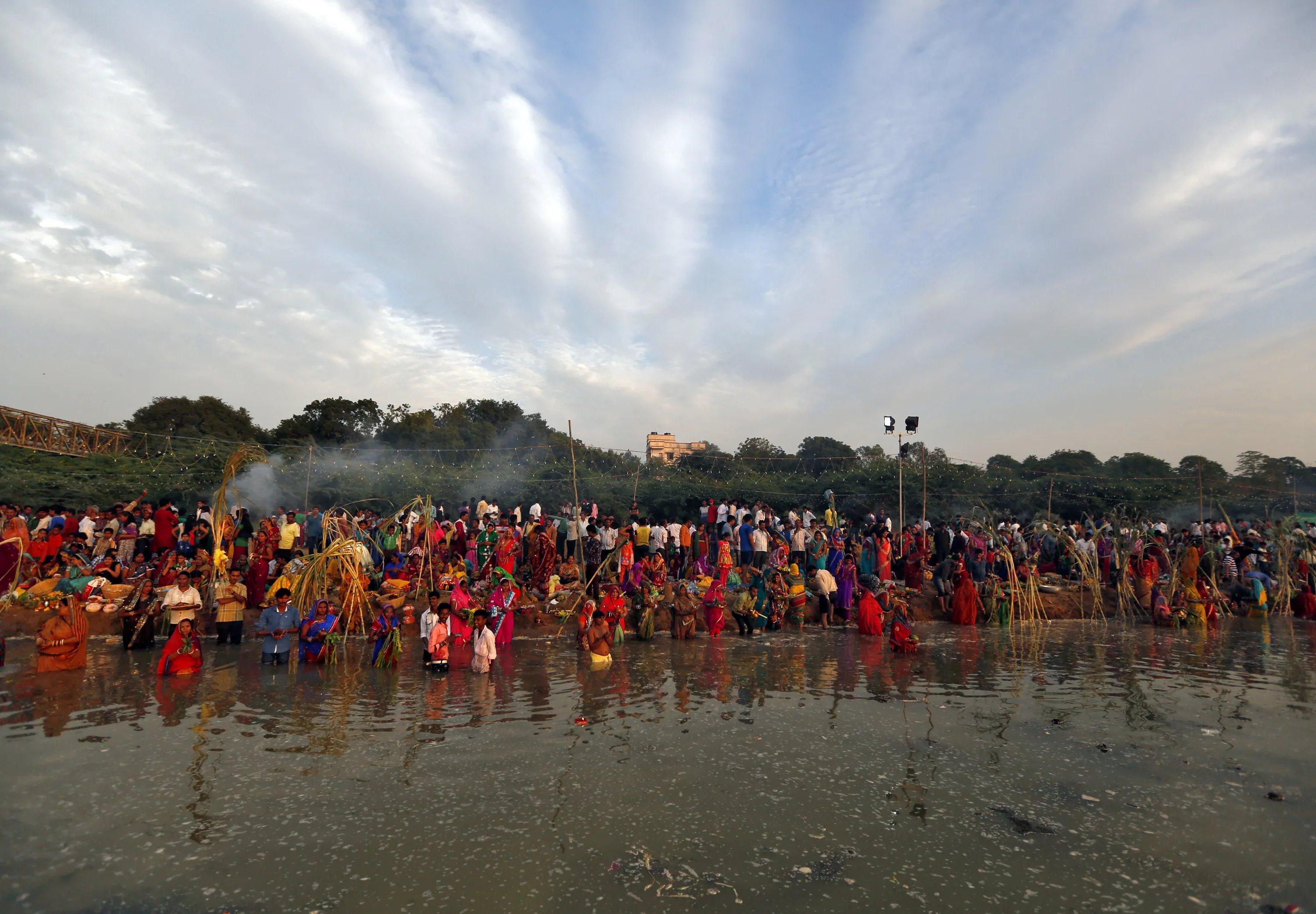 Hindu devotees gather to worship the Sun god Surya on the banks of the Sabarmati river during the Hindu religious festival of Chatt Puja in the western Indian city of Ahmedabad October 29, 2014. (Photo by Amit Dave/Reuters)