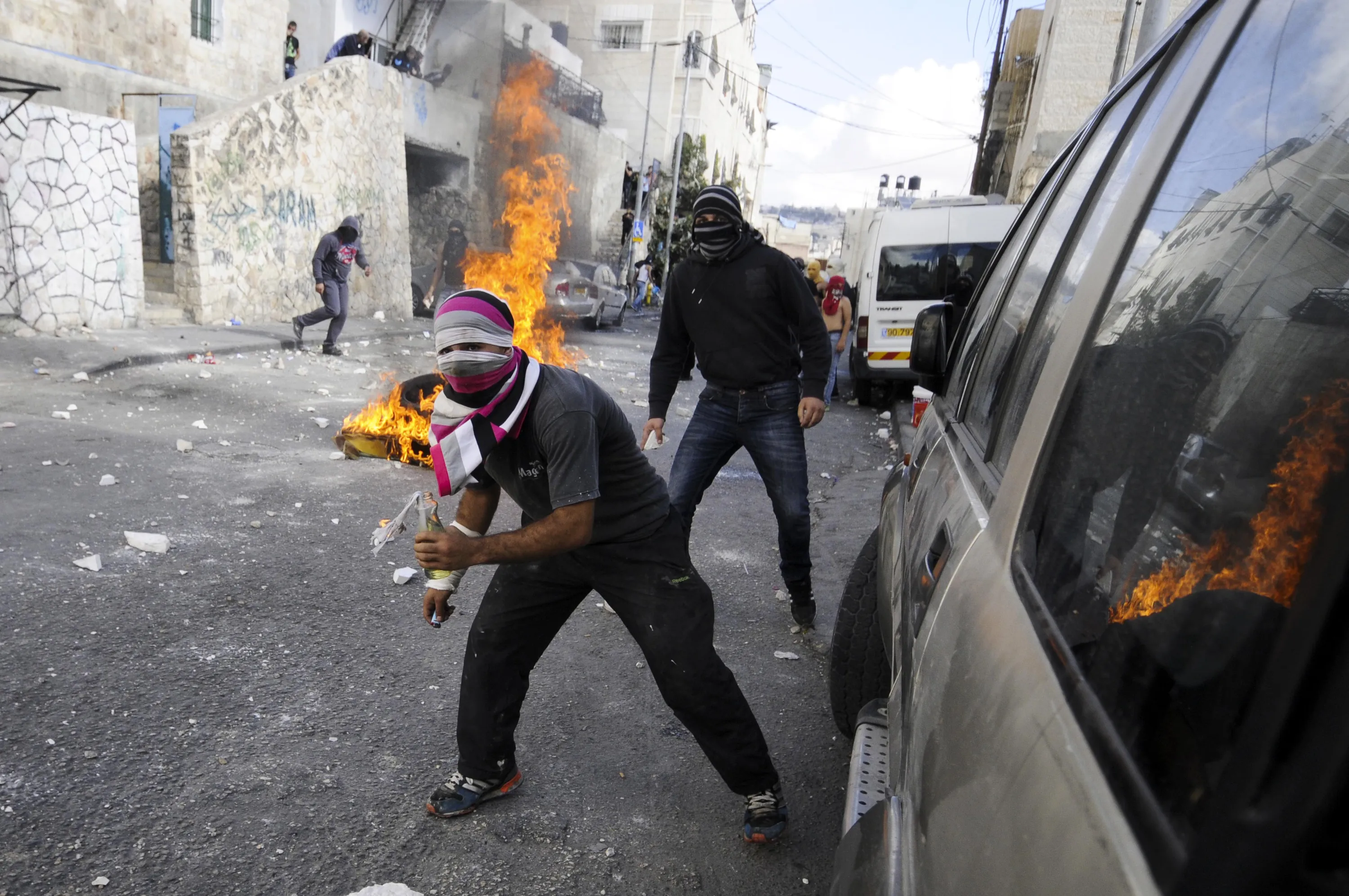 Palestinian youths clash with Israeli border police after Moatez Higazi was shot in east Jerusalem, Thursday, October 30, 2014. Israeli police shot and killed Higazi suspected of trying to kill a hard-line Jewish activist in Jerusalem, an incident that quickly sparked clashes between masked stone throwers and Israeli riot police, threatening to further enflame the already high tensions in the city. (Photo by Mahmoud Illean/AP Photo)