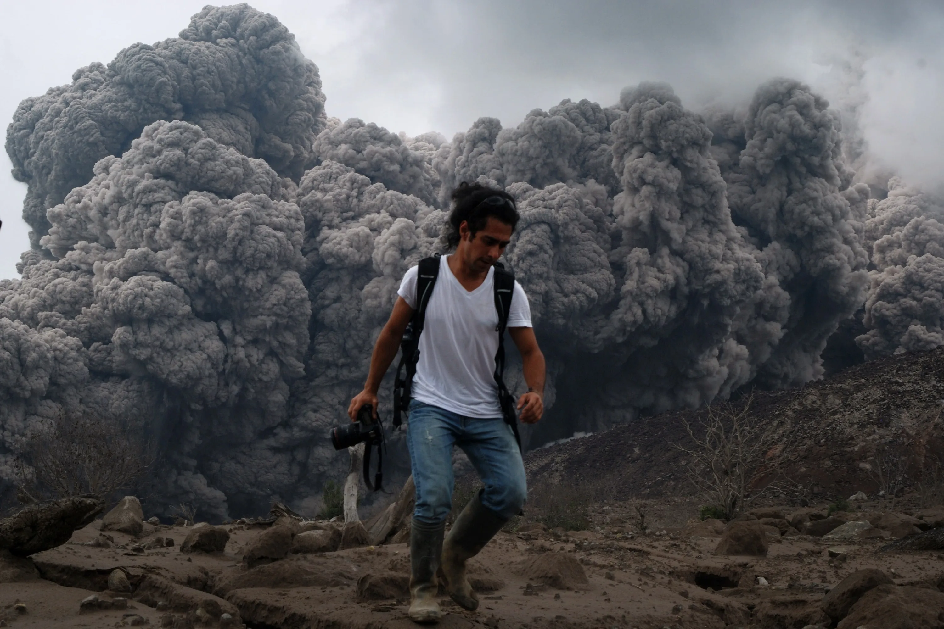 In this photograph taken on October 25, 2014, a photographer runs as Mount Sinabung volcano erupts with ash clouds, as seen from Karo District on Sumatra island. Super heated lava and giant ash clouds reaching two kilometers into the air spewed from the crater of Mount Sinabung volcano threatening villages during its recent series of eruptions. Sinabung began erupting on September 2013 and in February 2014 an eruption killed about 17 people while more than 33,000 residents were forced to flee their homes. (Photo by Sutanta Aditya/AFP Photo)