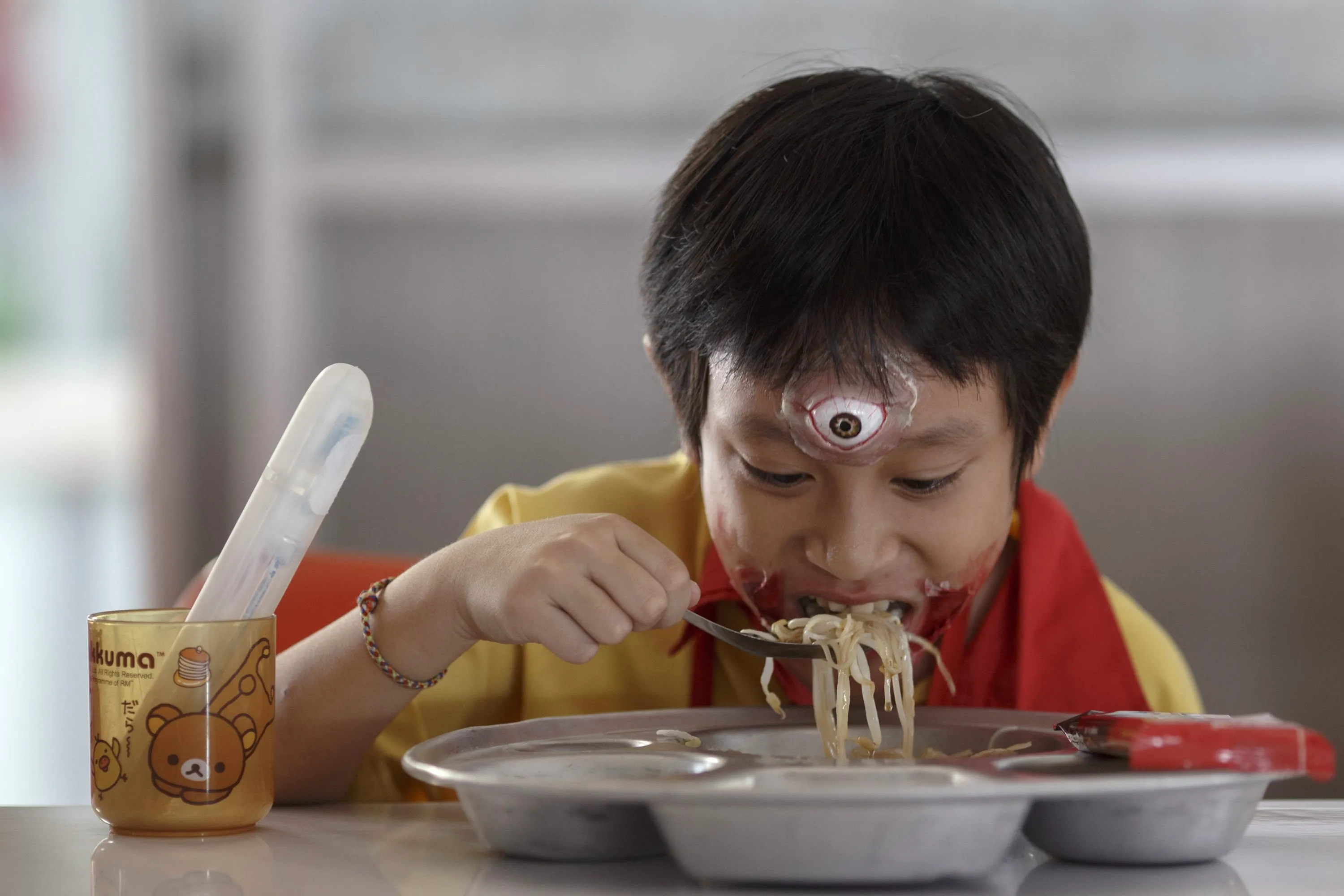A student with his face painted eats lunch before a halloween party at a school in Bangkok, Thailand, on October 31, 2014. (Photo by Athit Perawongmetha/Reuters)