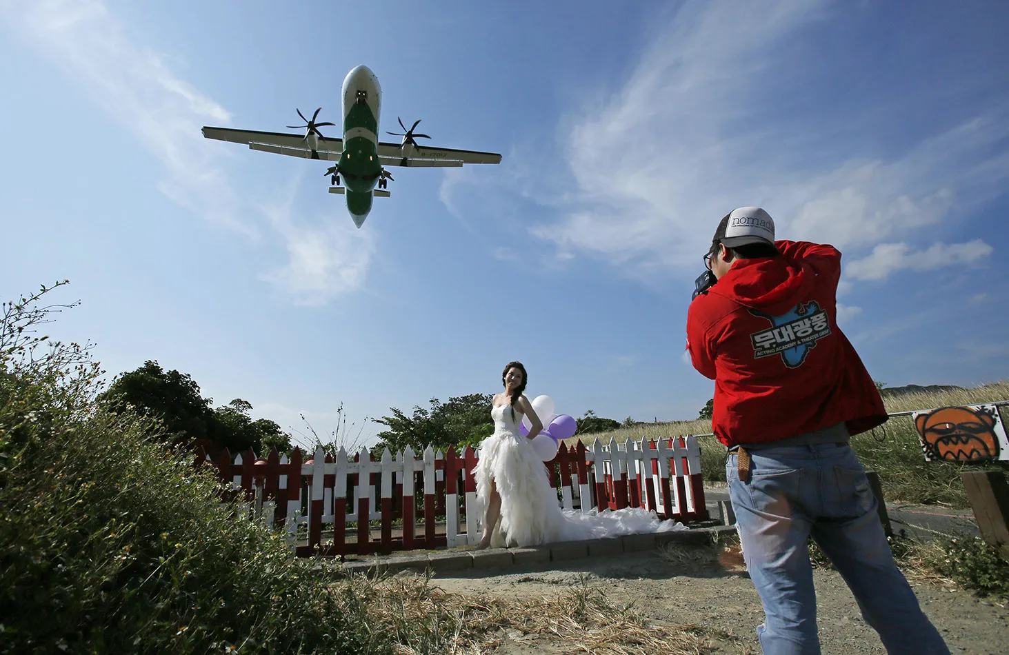 A bride has her wedding photos taken under the flight path at Songshan airport in Taipei, Taiwan, Thursday, October 30, 2014. (Photo by Wally Santana/AP Photo)