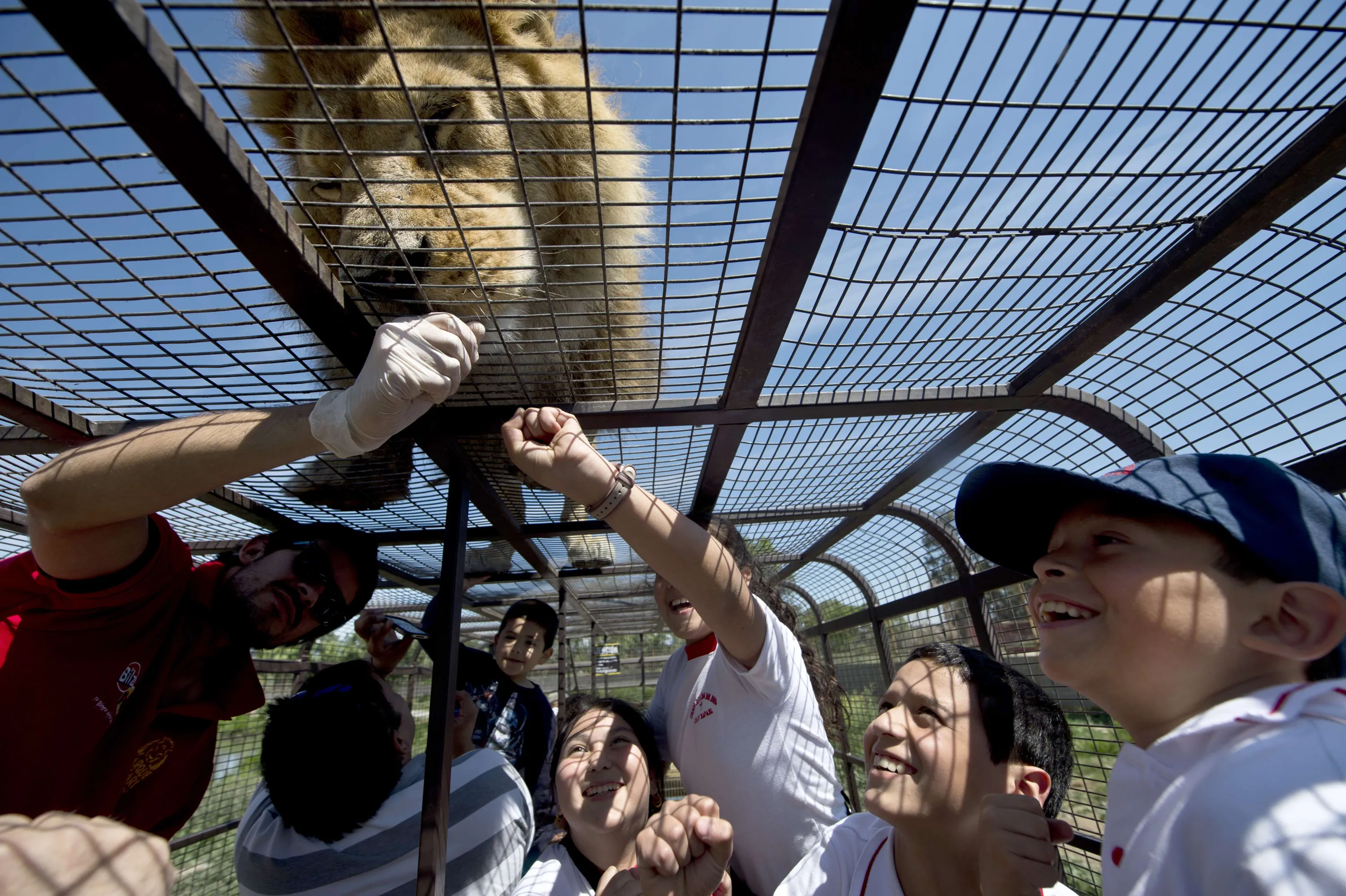 Children inside a cage watch at close quarters a lion at the Safari Lion Zoo in Rancagua, Chile, on October 30, 2014. the Safari Park Zoo is the only park in Latin America where tourists can see from a short distance six lions in a two-hectares open area. (Photo by Martin Bernetti/AFP Photo)