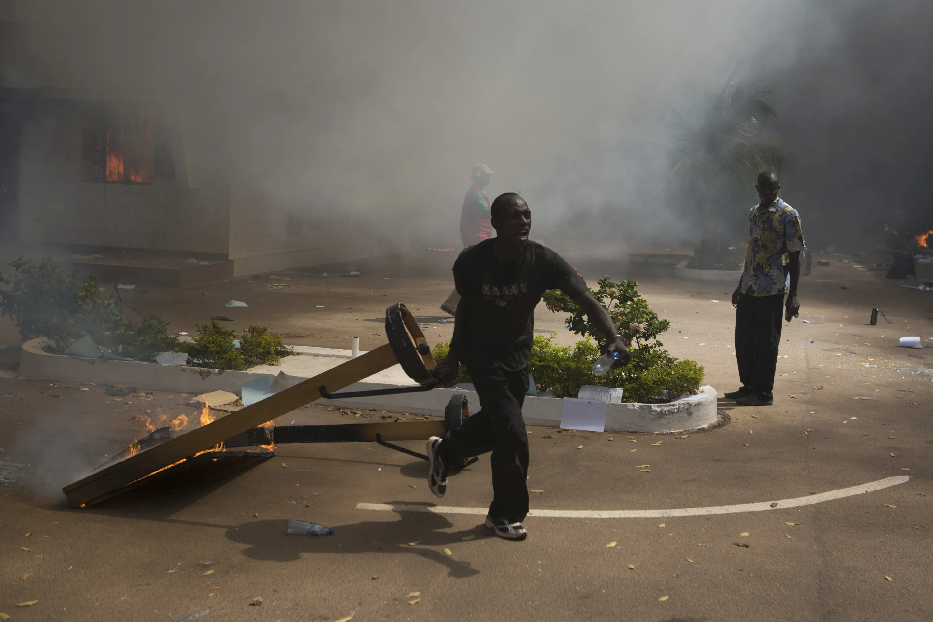 An anti-government protester carries a burning object outside the parliament building in Ouagadougou, capital of Burkina Faso, October 30, 2014. (Photo by Joe Penney/Reuters)