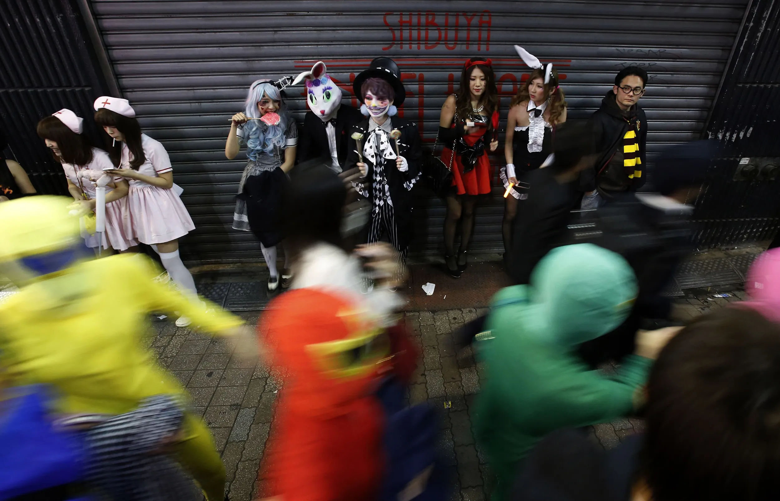 Participants, wearing make-up and costumes, eat candy during Halloween night in Tokyo's Shibuya district October 31, 2014. Thousands of costumed revellers descended on Shibuya crossing in downtown Tokyo on Friday to celebrate Halloween in what has in recent years become a incredibly popular Japanese past time. (Photo by Yuya Shino/Reuters)