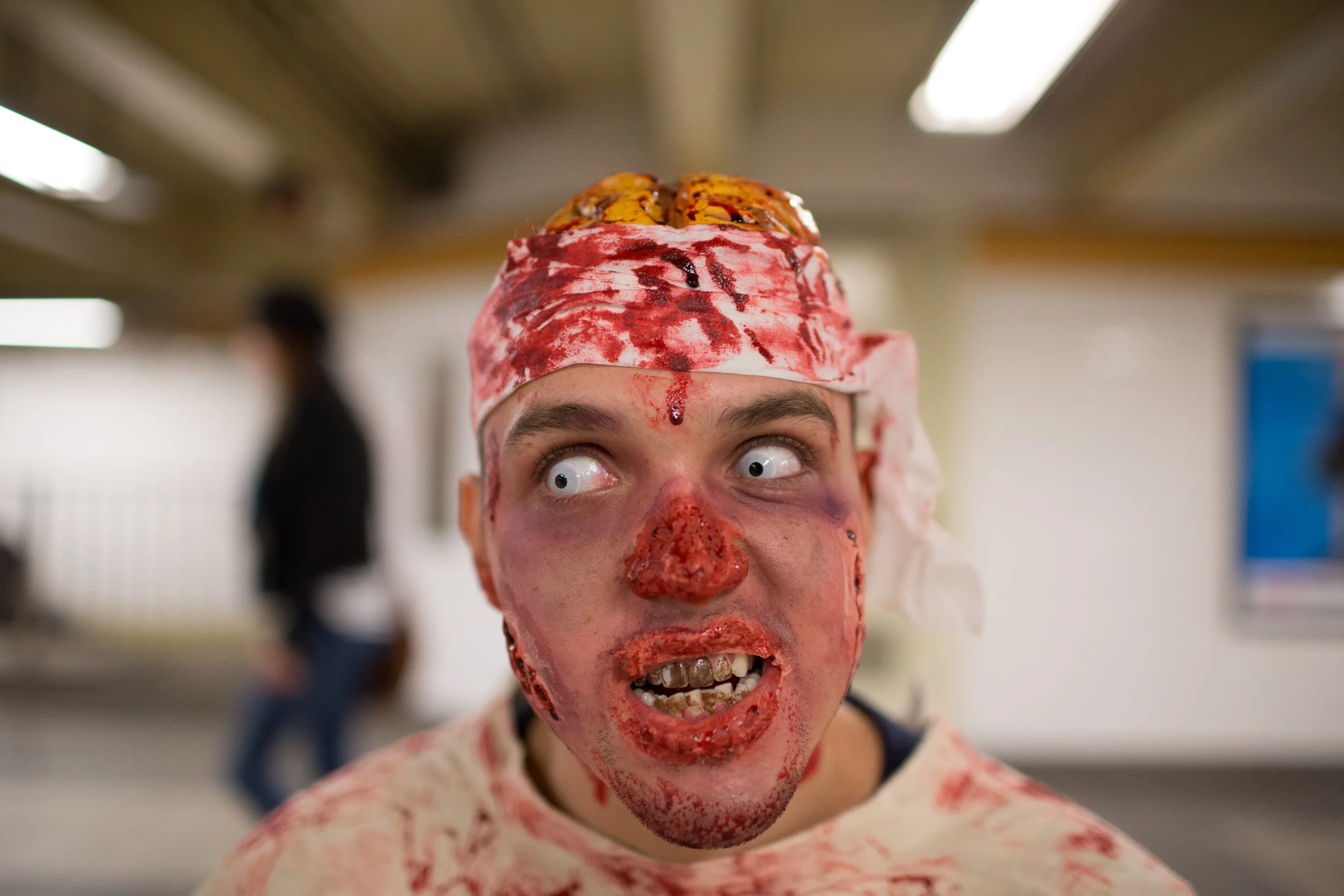 Jesus Pellot, dressed as a zombie, poses for a photo at the 14th St. station before heading to the 41st Annual Village Halloween Parade October 31, 2014 in New York City. (Photo by Kevin Hagen/Getty Images)