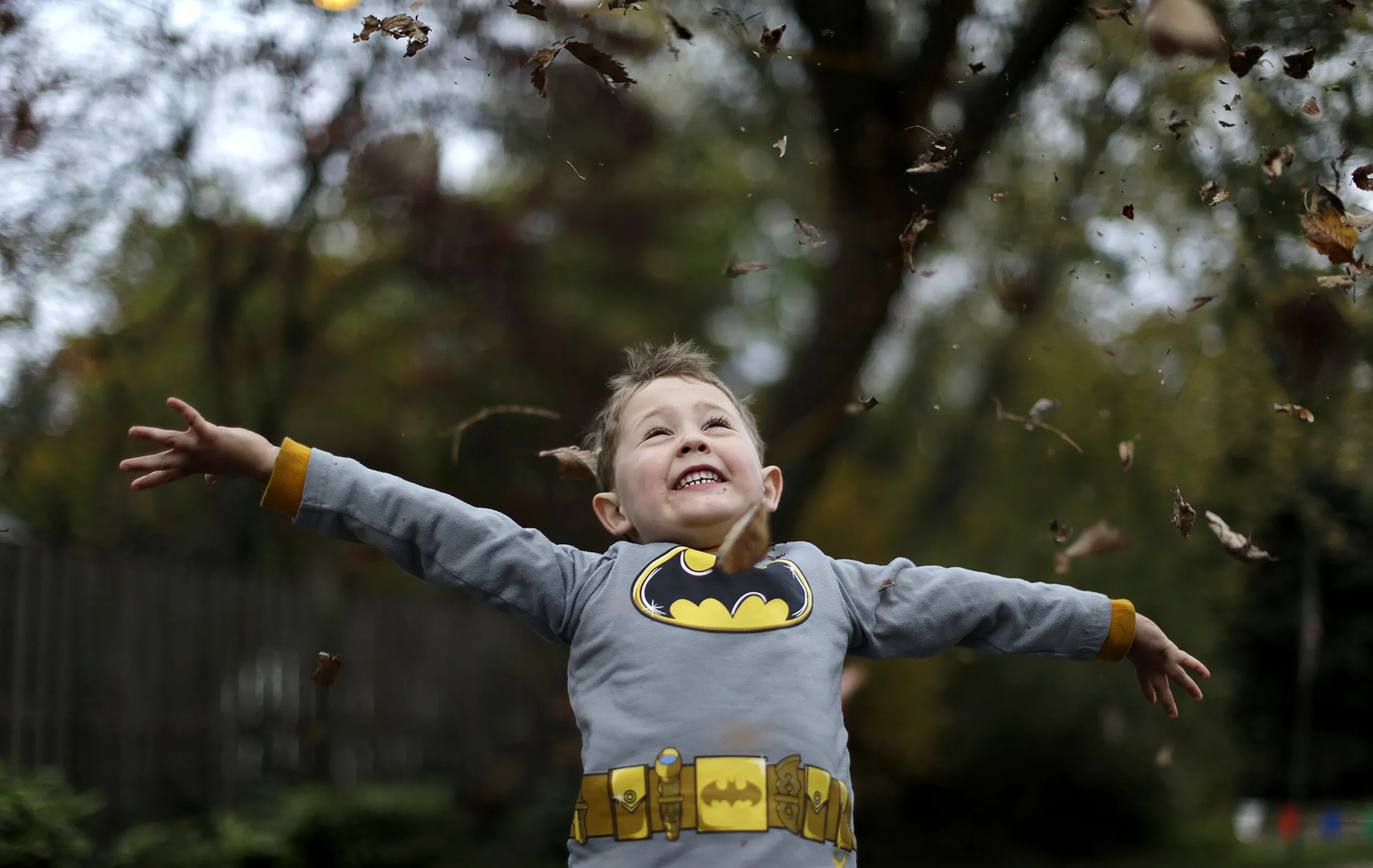 Benjamin Rocamp, who dressed as Batman, celebrates Halloween at the Flint family's annual Halloween block party in Silver Spring, Maryland October 31, 2014. The Flint family have decorated their house and thrown a theme block party for the last 17 years for neighborhood children and adults before the annual trick or treating. (Photo by Gary Cameron/Reuters)