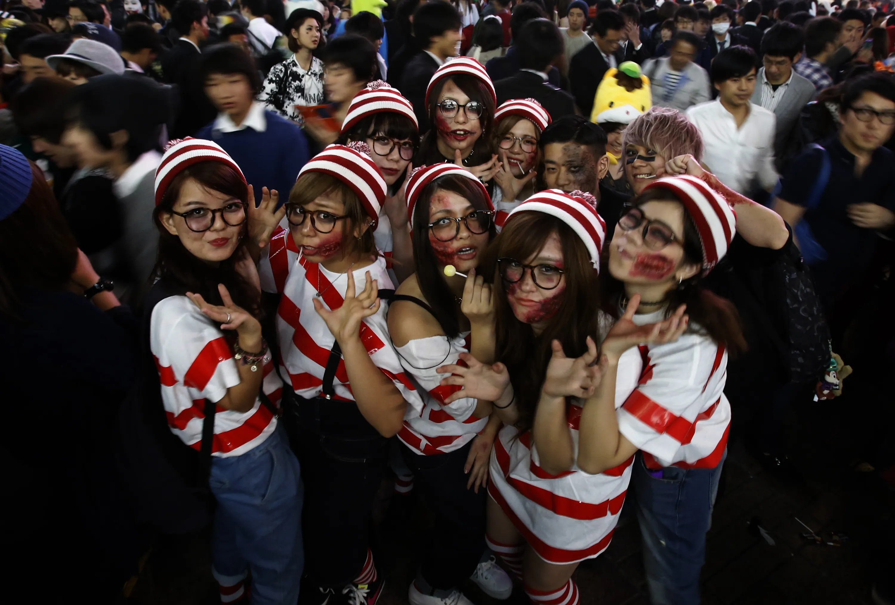 Participants, wearing make-up and costumes, pose during Halloween in Tokyo's Shibuya district, October 31, 2014. (Photo by Yuya Shino/Reuters)