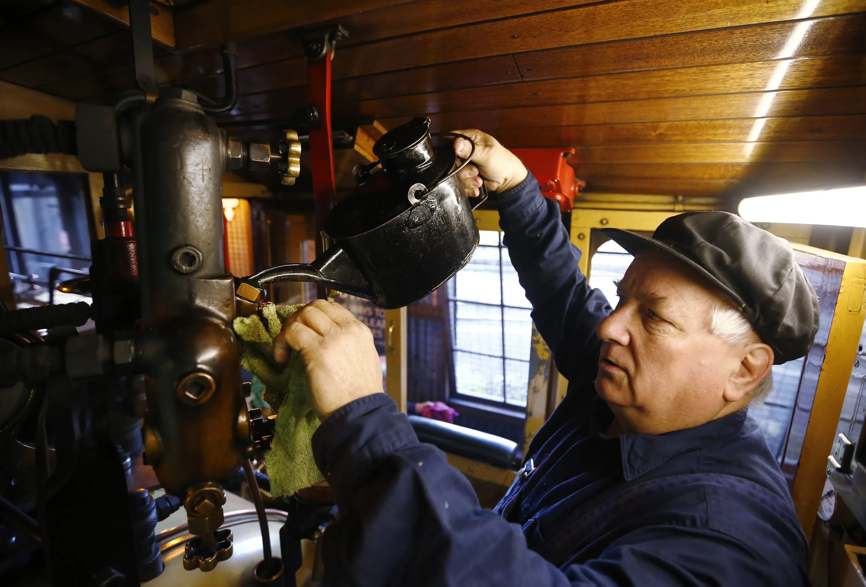 Puffing Billy steam engine driver Steve Holmes, 61, tops up the oil in a displacement lubricator in the cab of locomotive 12A as he prepares the engine for service at Belgrave near Melbourne, October 20, 2014. (Photo by Jason Reed/Reuters)