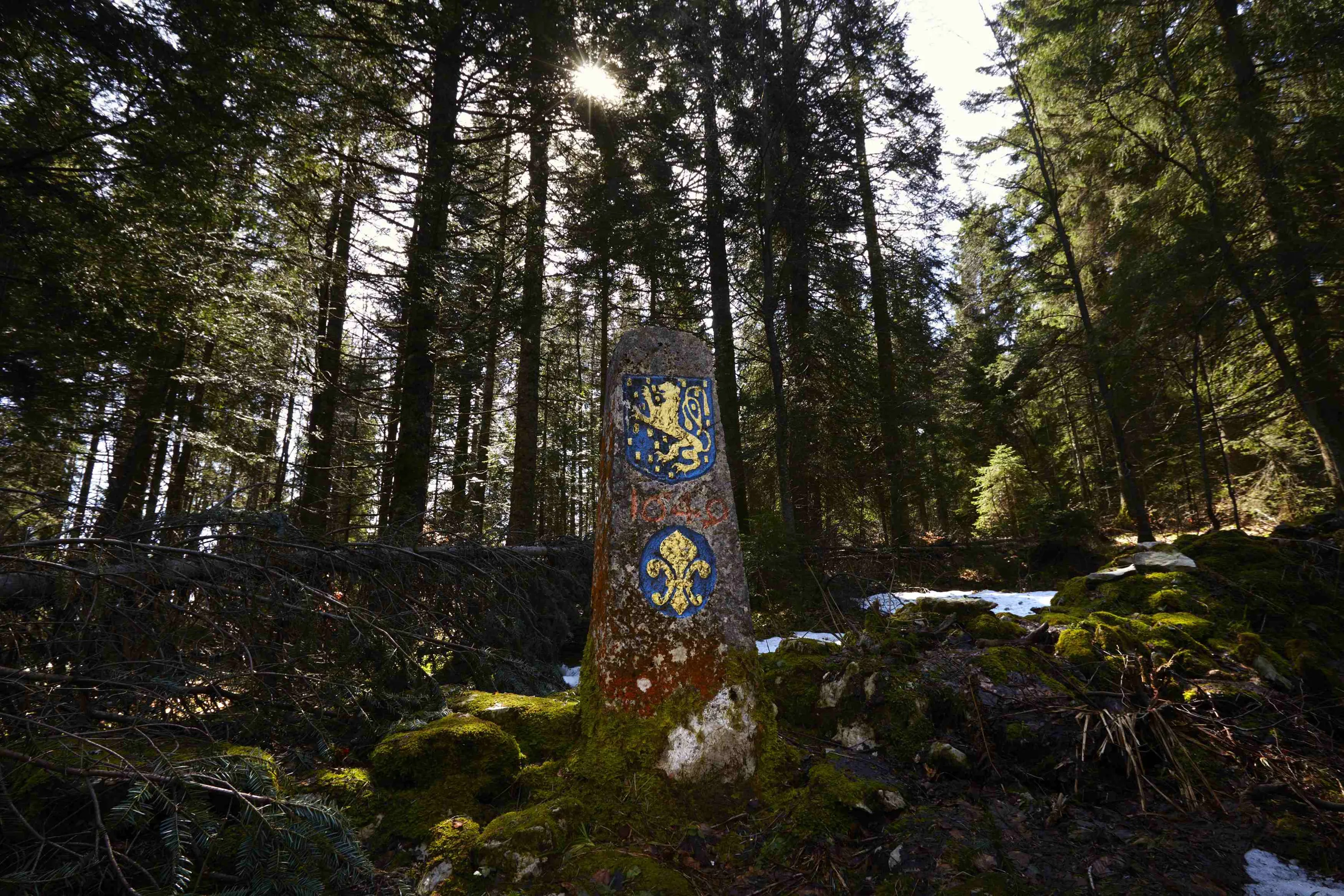 A fleur-de-lis coat of arms and the Franche Comte Lion are seen on a marker, dating from 1649, on the France (front) to Switzerland (back) border in the Marguerites Forest near Lajoux in the Vallee de Joux April 9, 2014. (Photo by Denis Balibouse/Reuters)