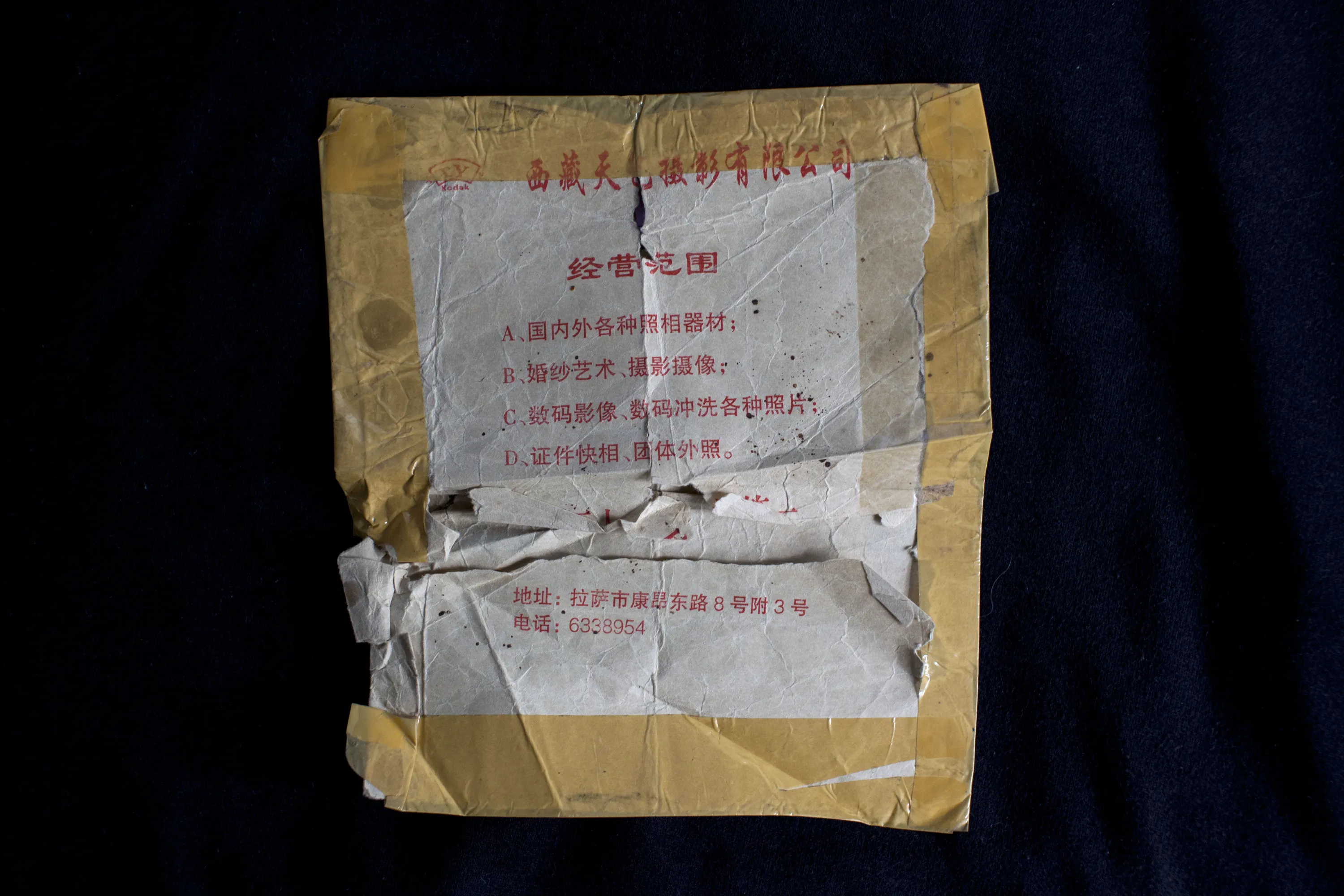 This Tuesday, September 30, 2014 photo shows an envelope with Mandarin prints that profile a photography company in Lhasa, preserved by Tibetan exile Dolma Kyi, 21, after she received a letter from her family in it in New Delhi, India. Kyi escaped from Tibet in 2001 when she was around 8 years old. She says she missed her parents most while still in school and other students would have their parents visiting them. (Photo by Tsering Topgyal/AP Photo)