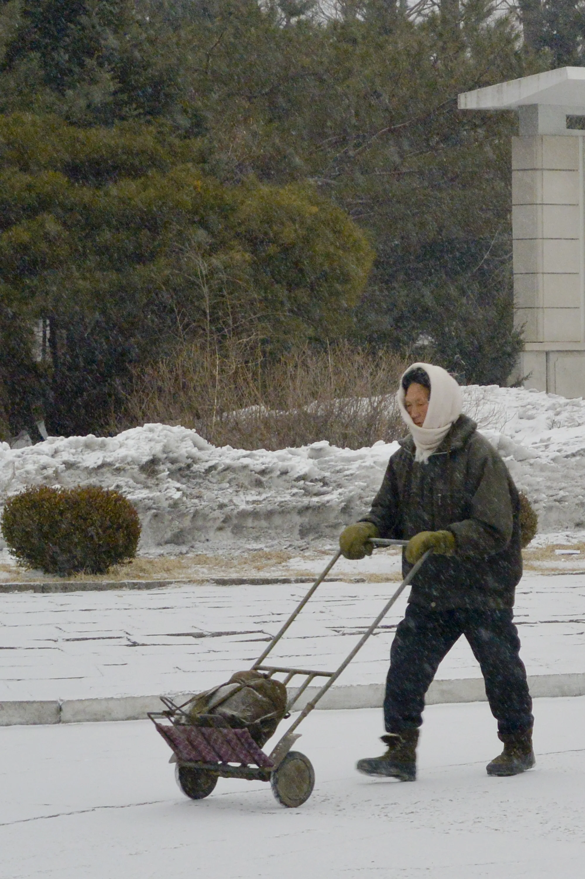 A local pushes a load while dressed in warm clothes in February 2013, in Pyongyang, North Korea. (Photo by Andrew Macleod/Barcroft Media)