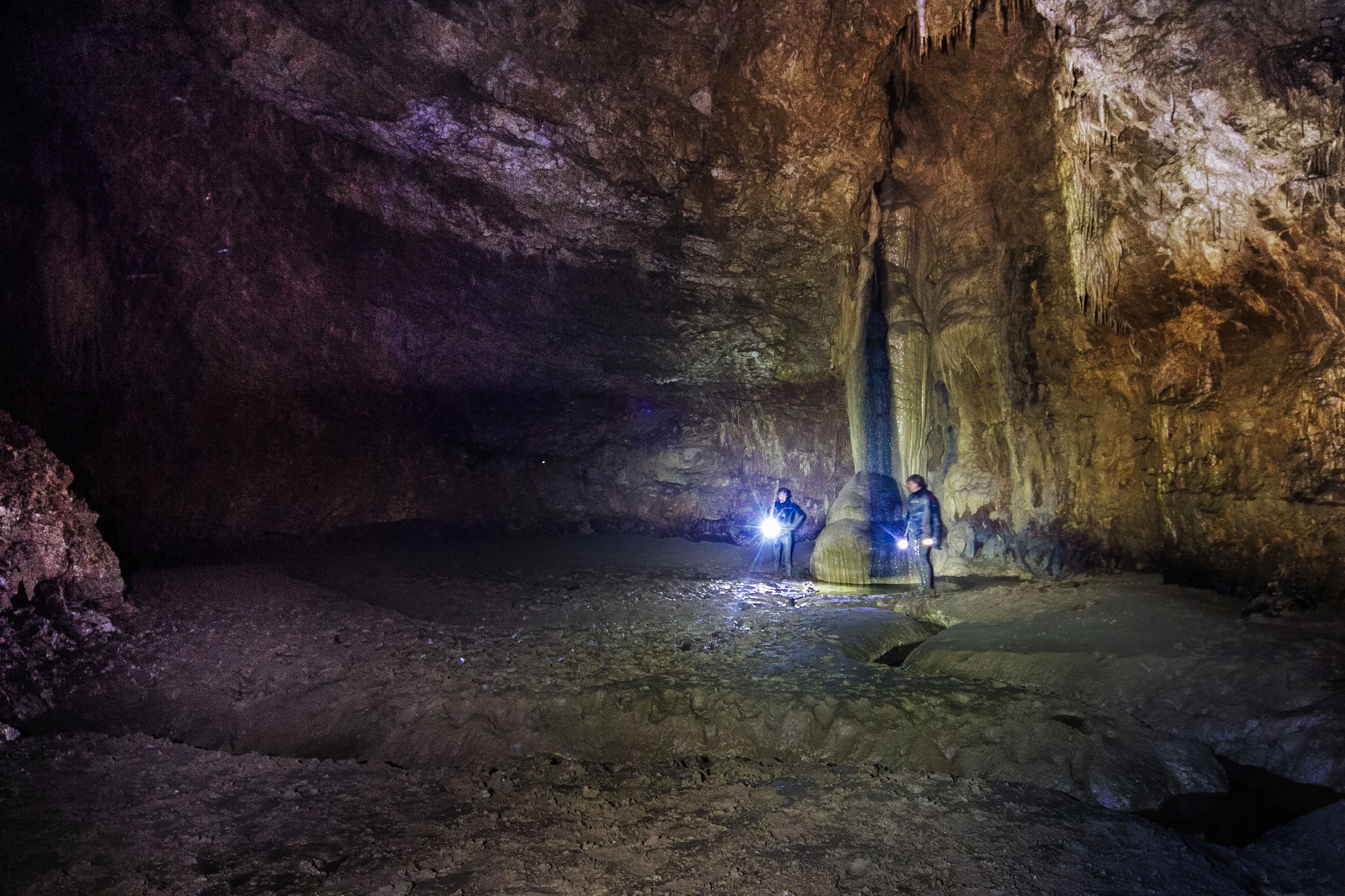 A caver known only as Pavel (L) and an unamed caver inside a huge open chamber. (Photo by Vladimir Mulde/Caters News)